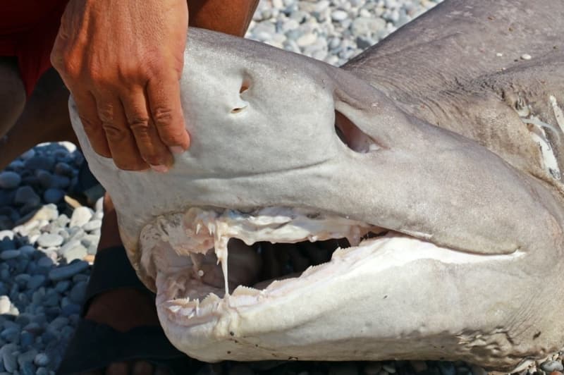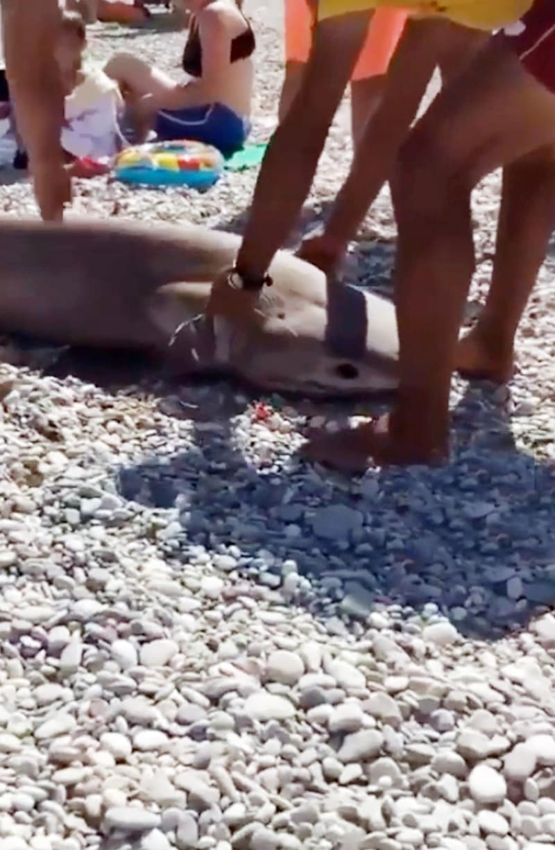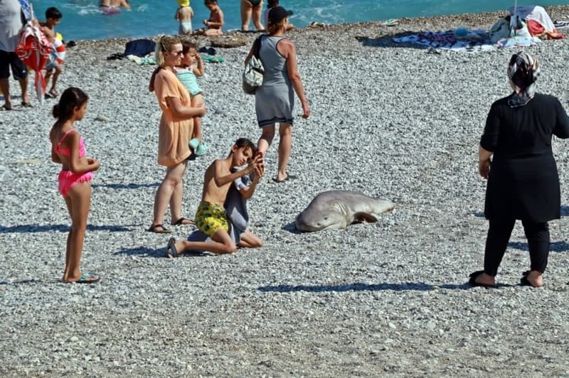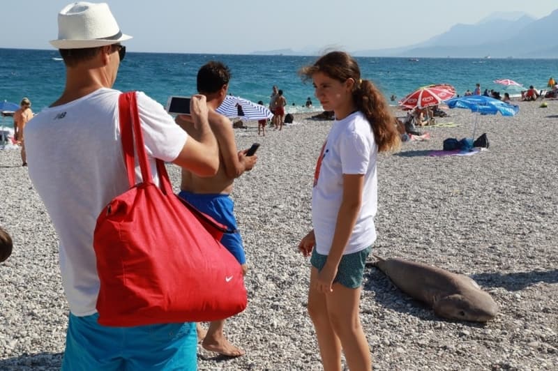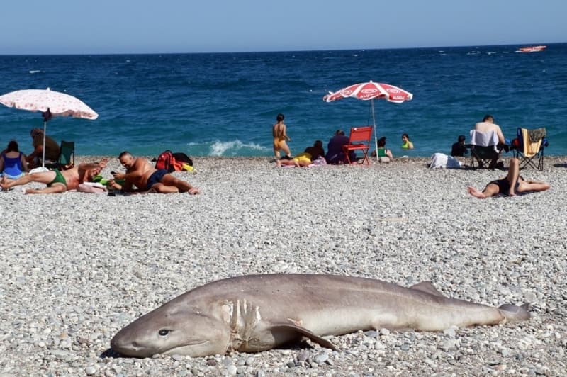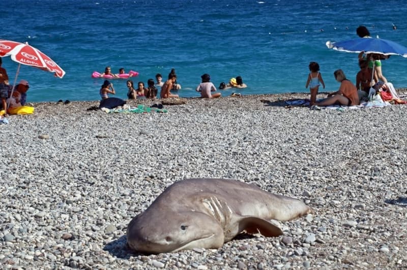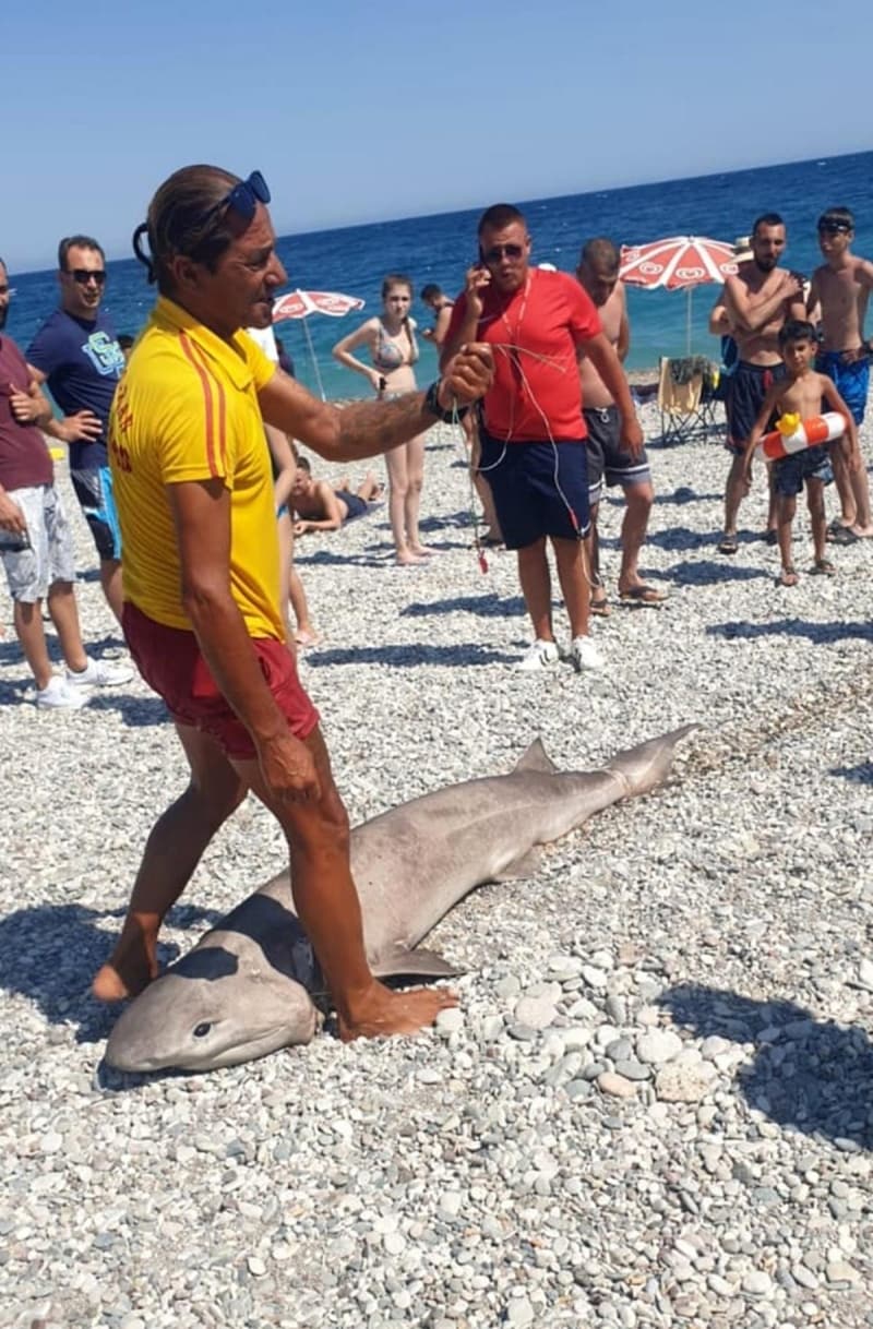 Antalya'nın dünyaca ünlü Konyaaltı Sahili'nde denize girenlerin ‘boğulan birisi' olduğunu düşünerek ihbar ettikleri cismin, köpek balığı ölüsü olduğu anlaşıldı. Yüzgecinden sürükleyerek kıyıya çıkarılan köpek balığının, 2 metre olduğu görüldü.