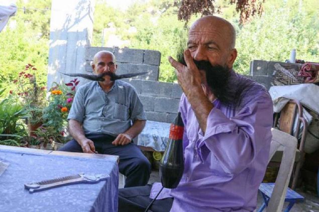 Hatay'da 20 yıldır hiç kesmedikleri bıyıklarını 80 santimetreye kadar uzatmayı başaran iki kuzen, haftada bir bakım yaptırıp saç kurutma makinesi ve saç spreyi kullanarak şekil verdikleri bıyıklarıyla ilgi odağı haline geldi.