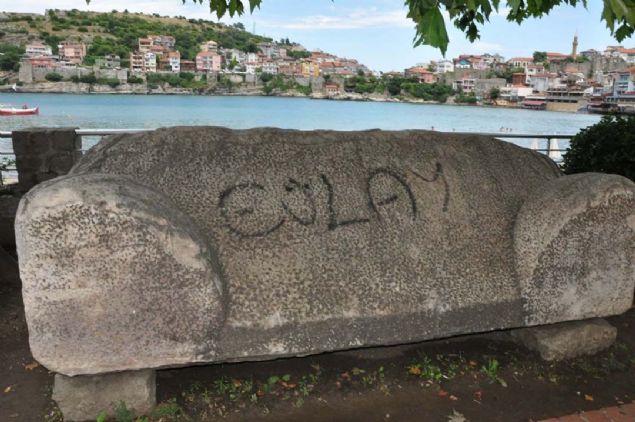 3 bin yıllık tarihi geçmişe sahip ilçede, Amasra Müze Müdürlüğü bahçesinde yer olmadığı için 15 yıl önce Kum Mahallesi'ndeki yürüyüş yoluna konulan Roma dönemine ait lahit mezar kapağı ve mezarı üzerine siyah sprey boya ile 'Gülay' yazıldı. Lahit mezar taşındaki yazıyı görenler tepki gösterdi.
