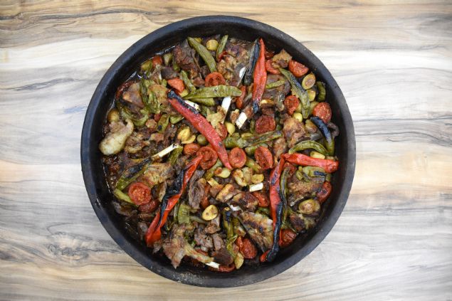 Bir gün sütte bekletilen, iki gün baharatlarla marine edilen zeytinyağında dinlendirilen kuzu eti, ardından kuyruk yağı, domates, biber ve sarımsakla buluşarak taş fırına girmek için hazır hale geliyor.