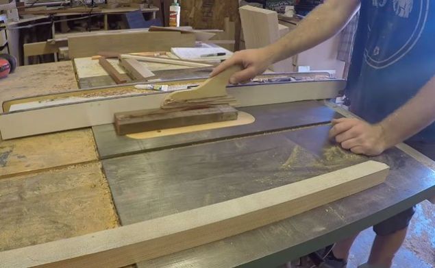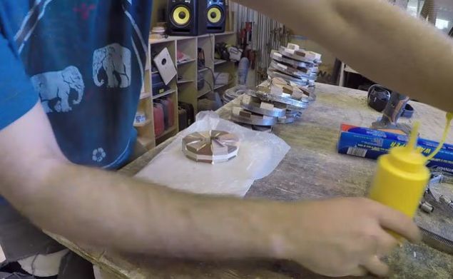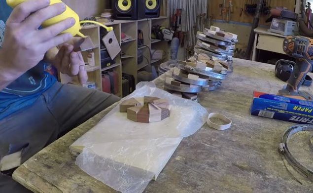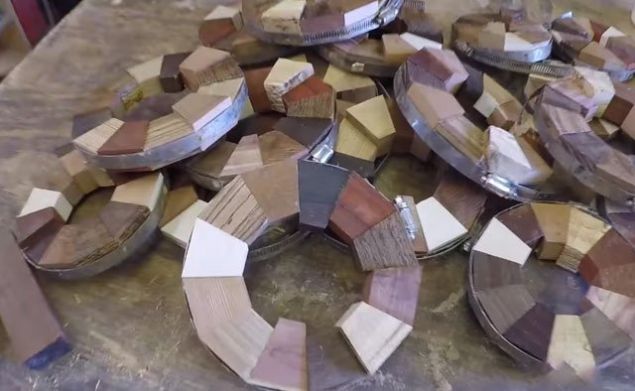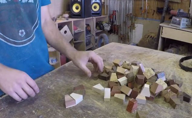 Çok çeşitli ağaç türlerini bir araya getirdikten sonra ufak ufak kesen adam daha sonra parçaları tutkalla birleştirdi.