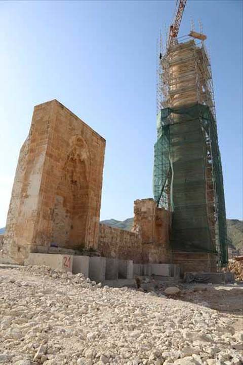 Batman'ın tarihi Hasankeyf ilçesinde yapımı tamamlanan Ilısu Barajı'ndan etkilenen ve arkeoparka taşınan Süleyman Han Camisi'nin 612 yıllık minaresi yeni yerinde yükseliyor.