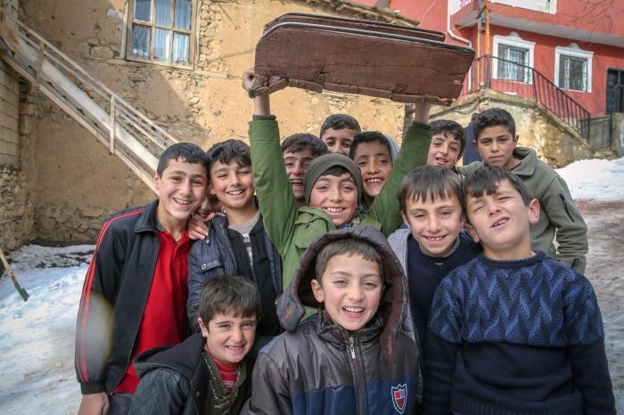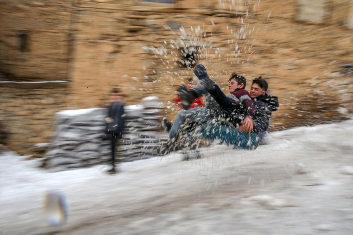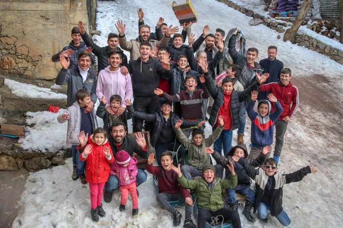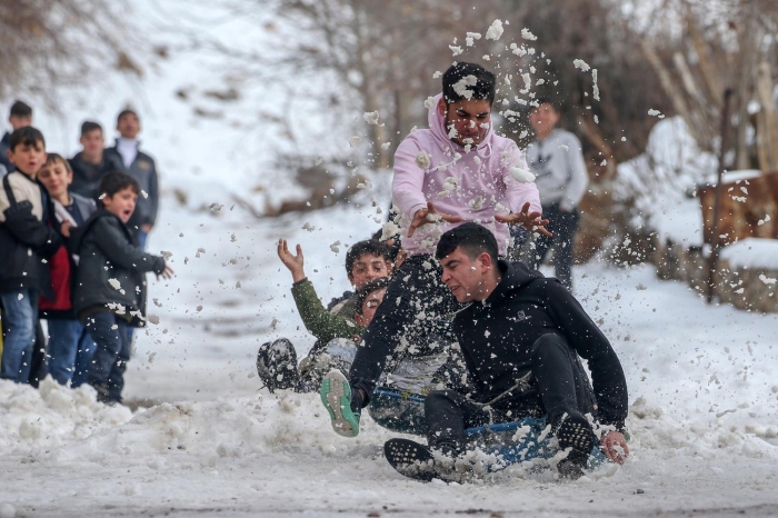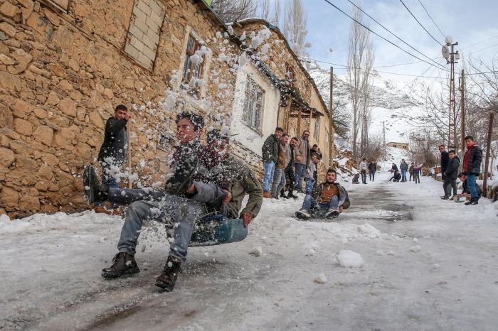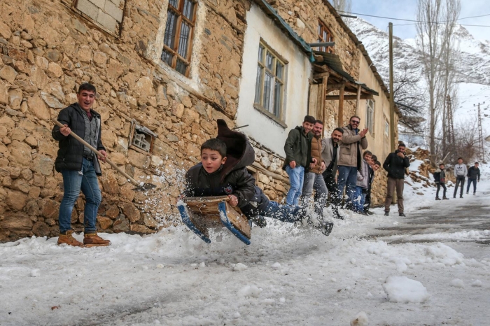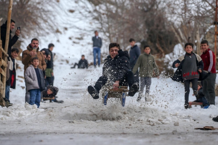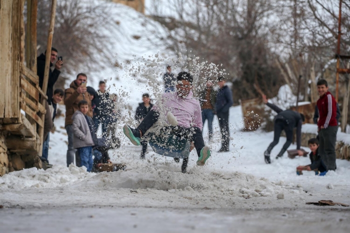Kentte kışın en çetin geçtiği, yolunun sürekli kapanması nedeniyle de '9'uncu gezegen' olarak adlandırılan Bahçesaray'da karın ardından güneşli havayı fırsata dönüştüren çocuklar, eğlenceli anlar yaşıyor.