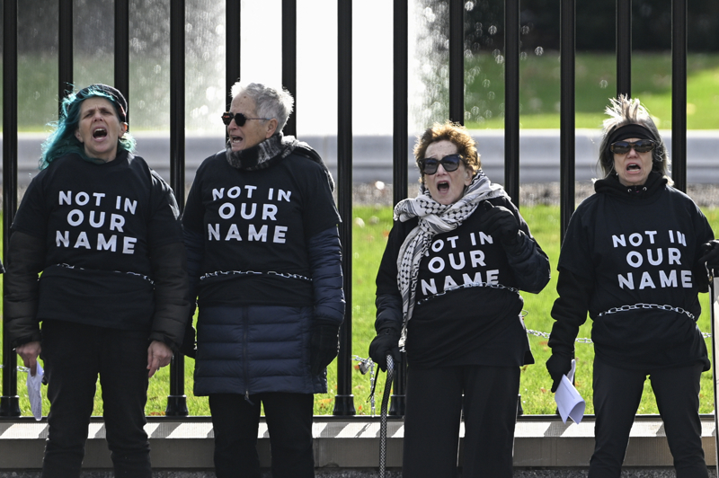 Bir grup Yahudi gösterici, Washington'ın Gazze politikasını protesto etmek amacıyla kendilerini Beyaz Saray'ı çevreleyen çitlere zincirledi.