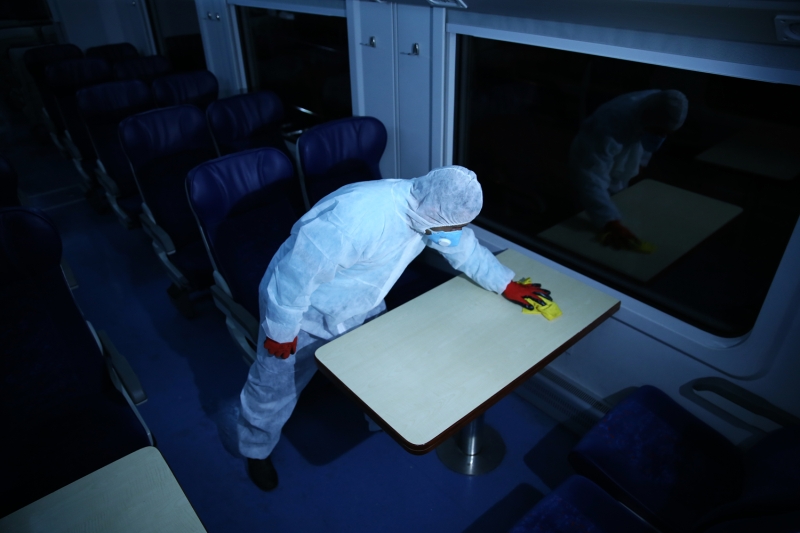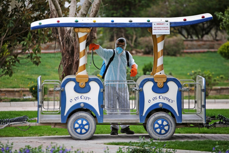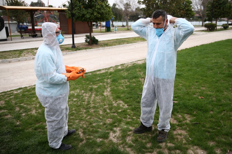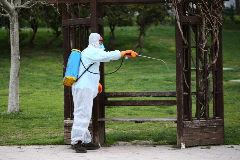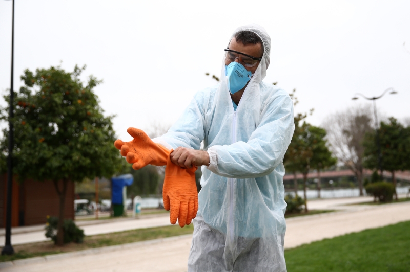 Türkiye genelinde alınan koronavirüs tedbirleri kapsamında ibadethanelerden okullara, parklardan toplu taşıma araçlarına kadar dezenfekte işinde görev alan ekipler, tam donanımlı ekipmanlarıyla 7 gün 24 saat mesai yapıyor.