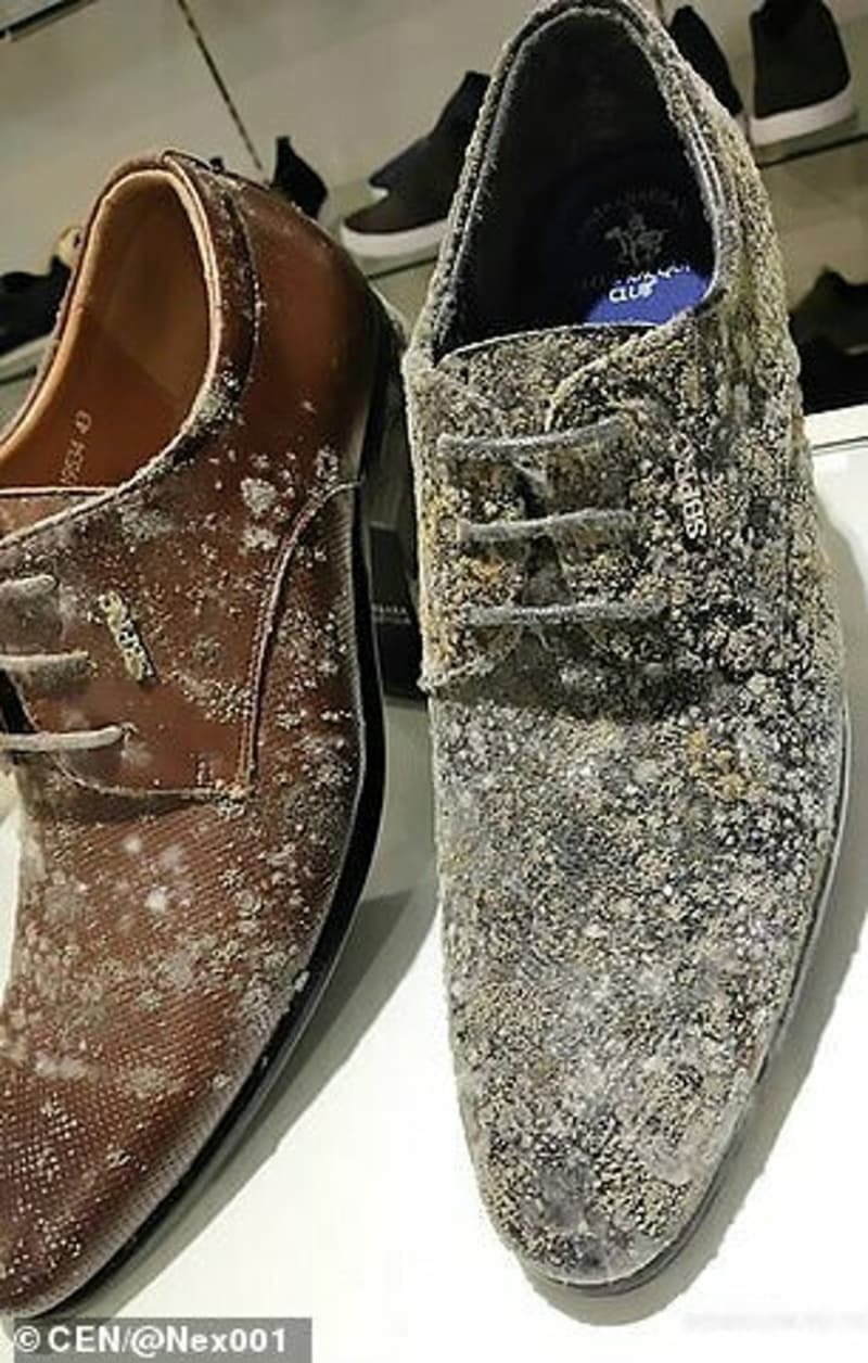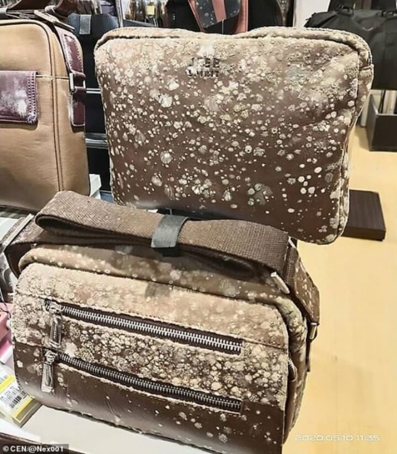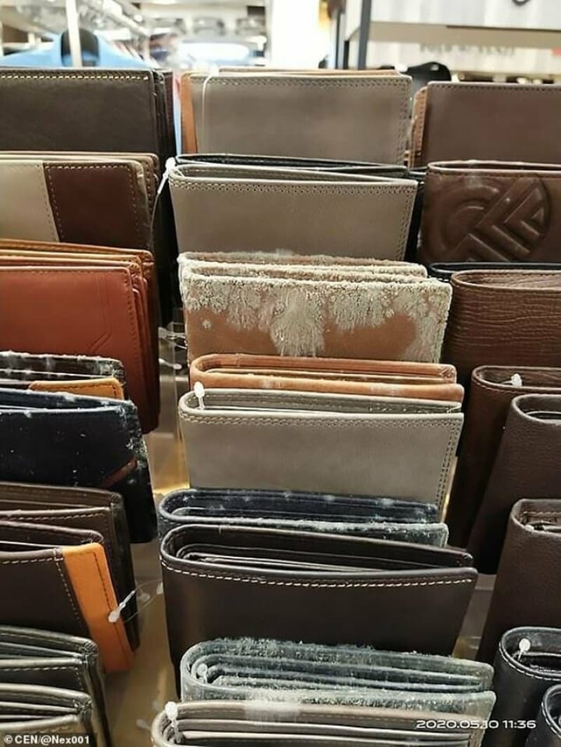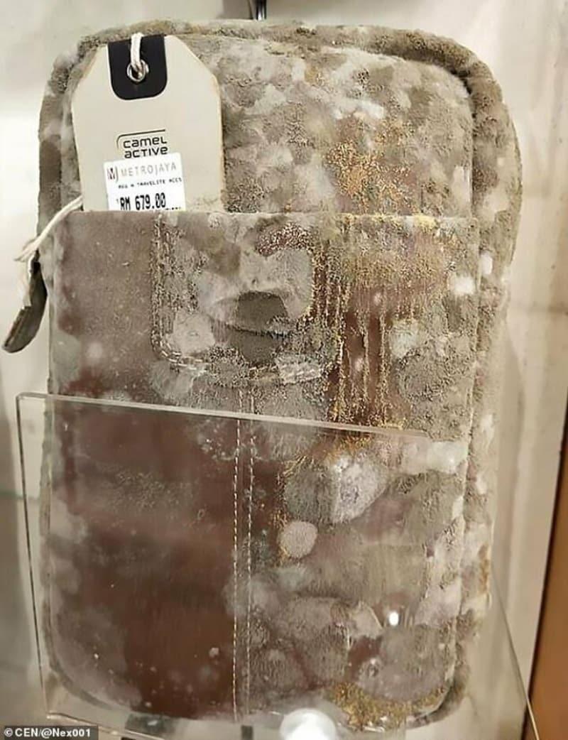 Malezya'da bir alışveriş merkezinde ortaya çıkan fotoğraflarda deri bütün ürünlerin küflendiği görüldü.