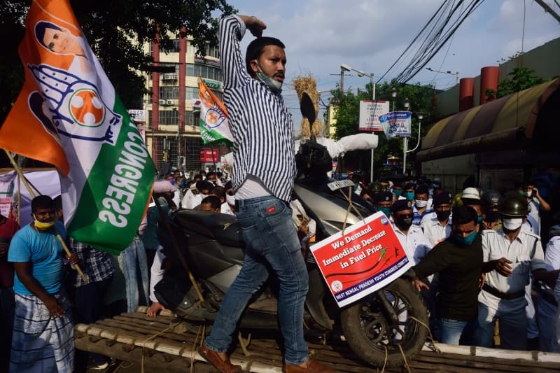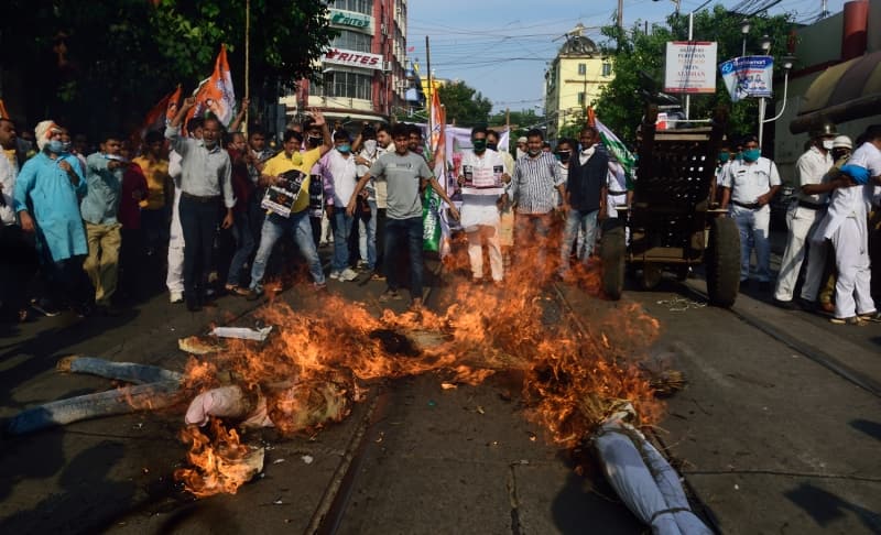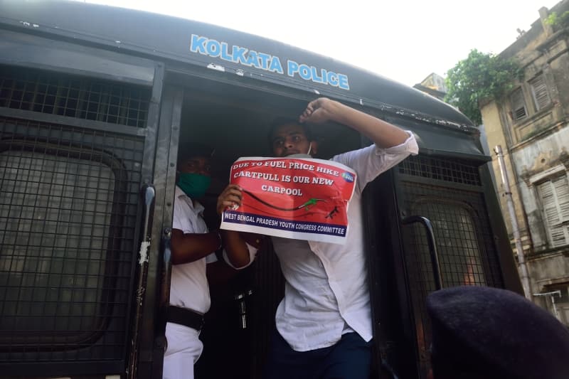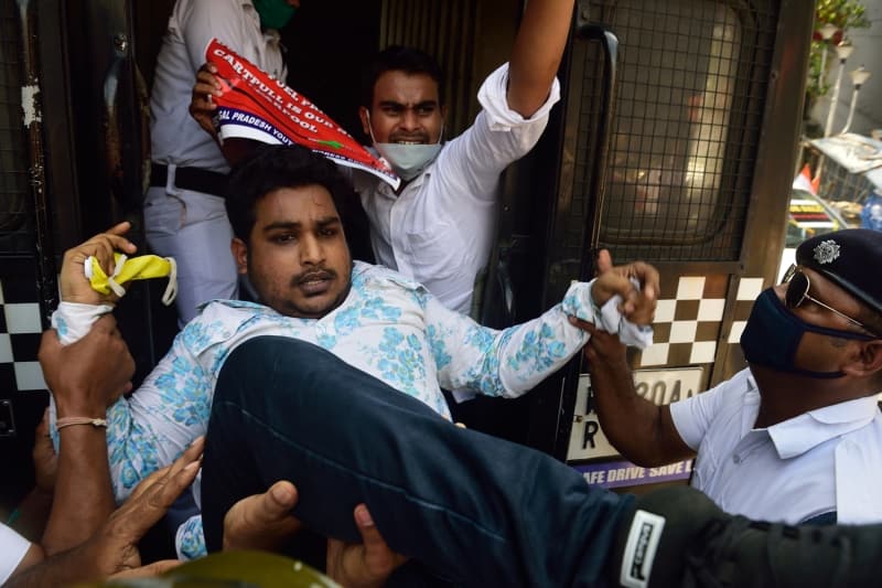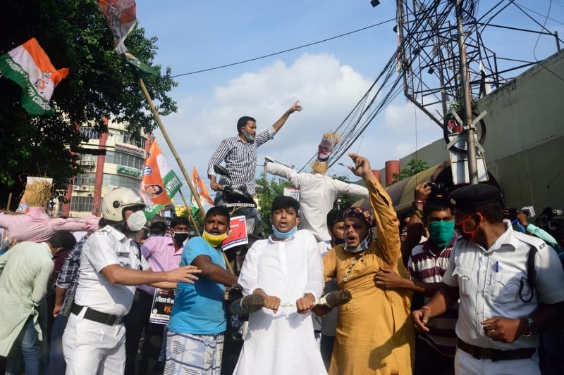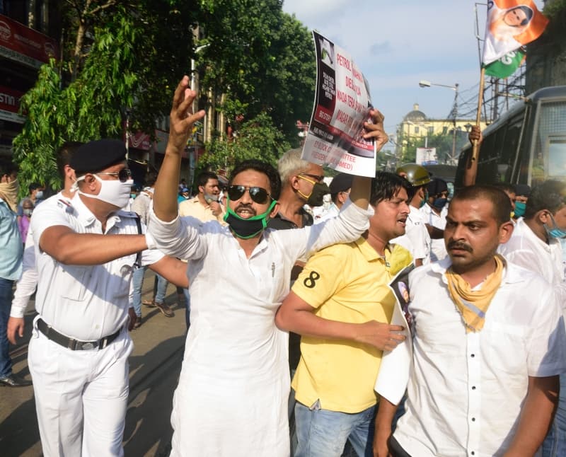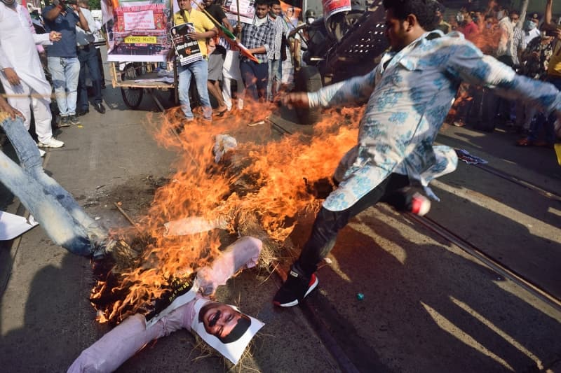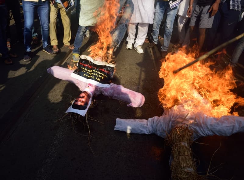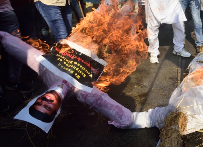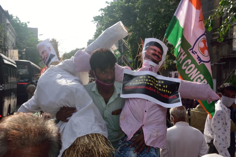 Petrol Bakanı Dharmendra Pradhan'ın kuklasının yakıldığı gösteride bazı göstericiler gözaltına alındı.