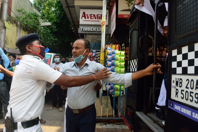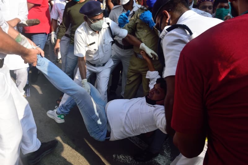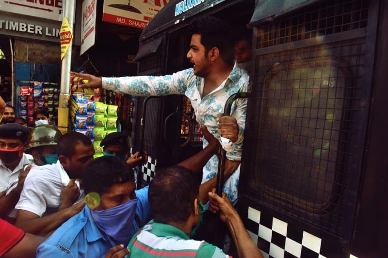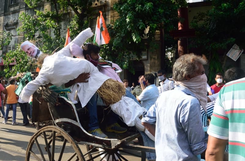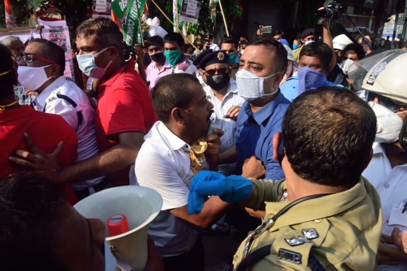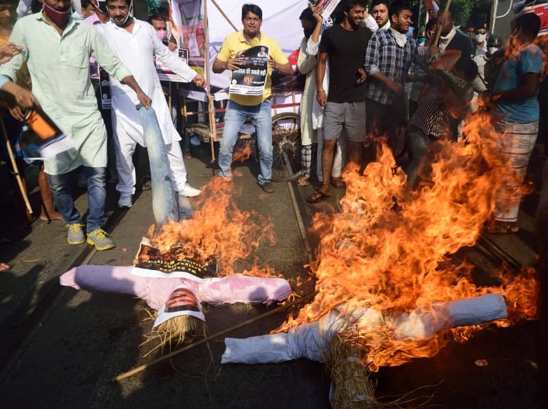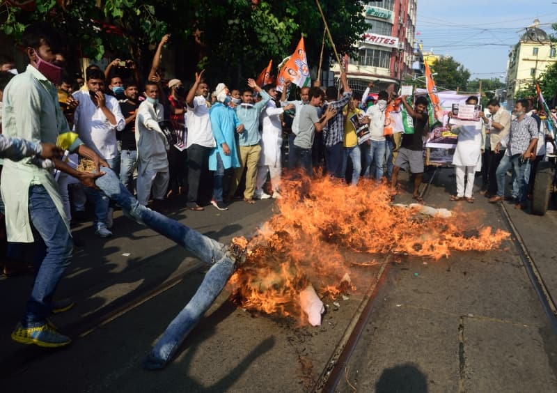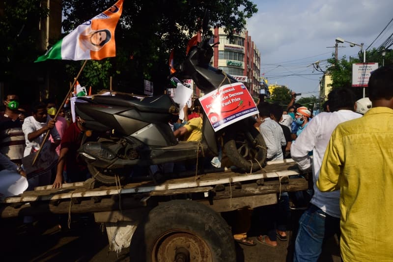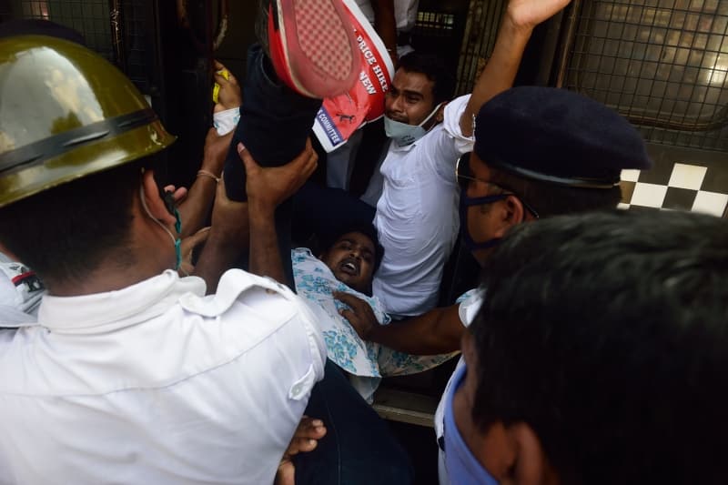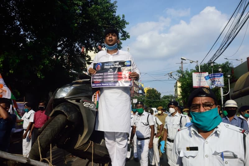 Petrol Bakanı Dharmendra Pradhan'ın kuklasının yakıldığı gösteride bazı göstericiler gözaltına alındı.