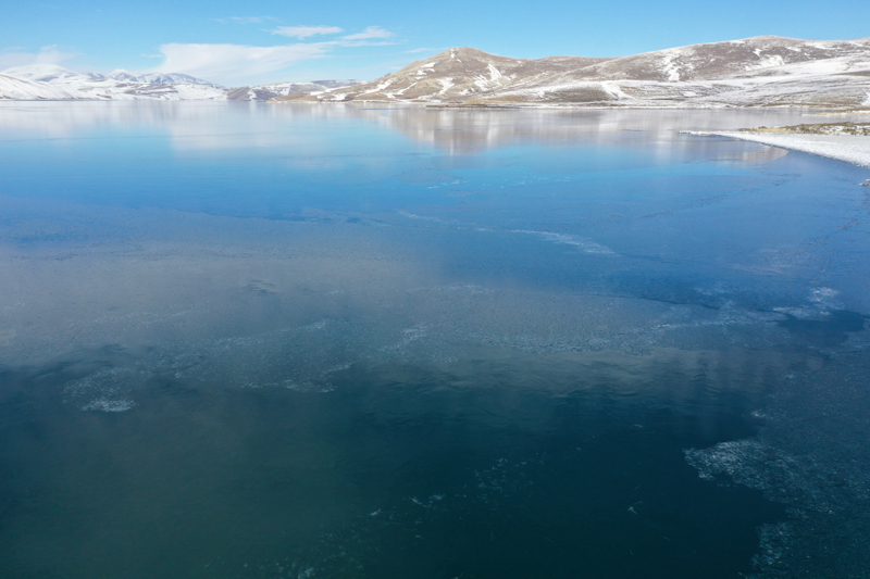 Buzla kaplı göl ve çevresindeki doğal güzellikler, dronla görüntülendi.