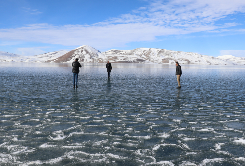 Çevresi karla kaplı göle gelen bazı vatandaşlar, buz üzerinde yürüyüş yapıp fotoğraf çektirdi.