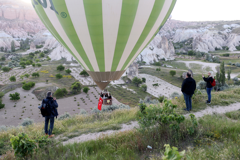 Türk bayraklı balonların oluşturduğu manzarayı izleyen turistler fotoğraf çektirdi.