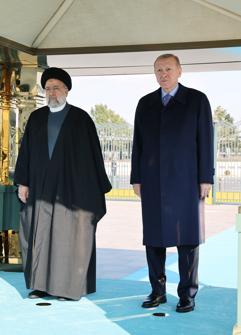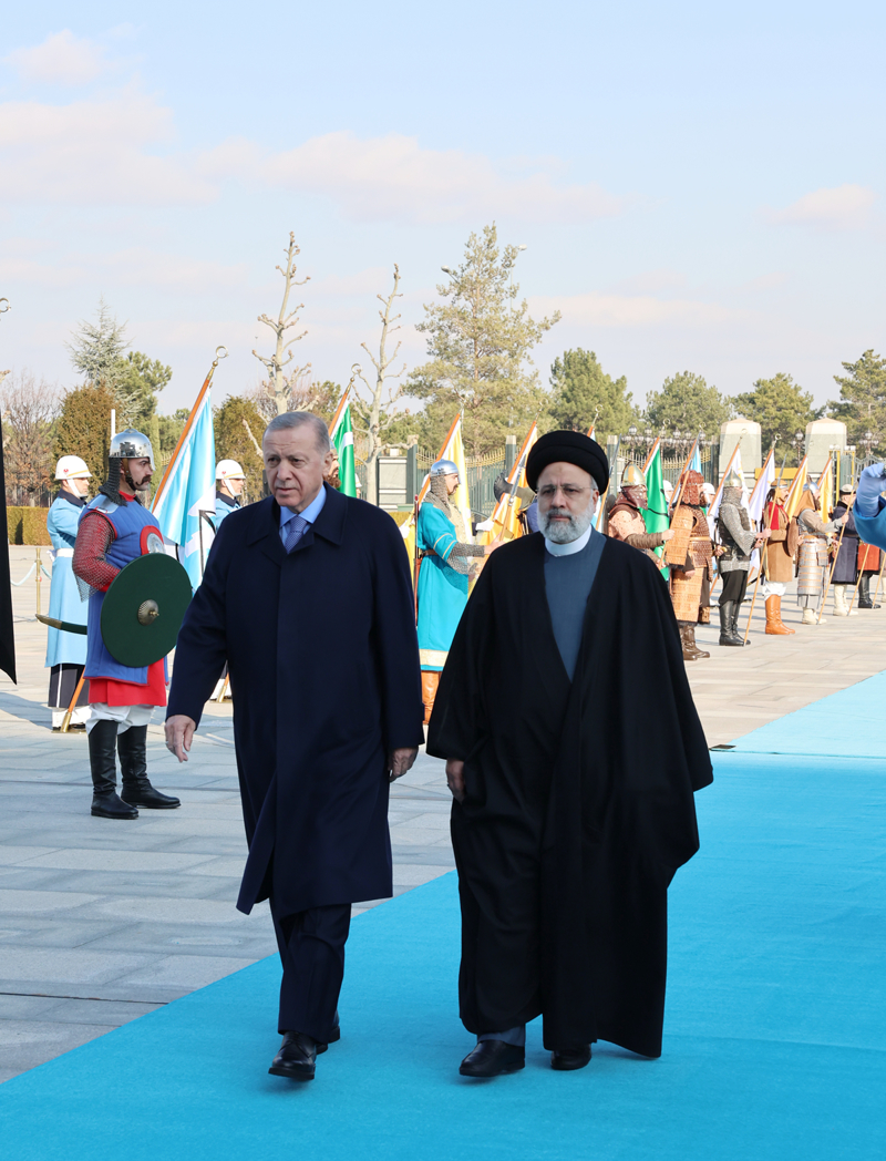 Erdoğan ve Reisi'nin tören alanındaki yerlerini almalarının ardından, 21 pare top atışı eşliğinde İstiklal Marşı ile İran milli marşı çalındı. Reisi, Muhafız Alayı Tören Kıtası'nı 'Merhaba asker' diyerek Türkçe selamladı.