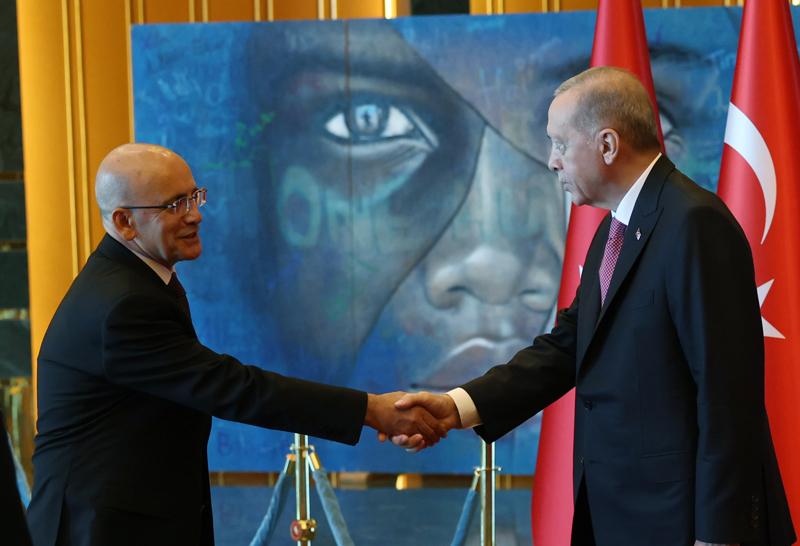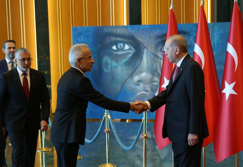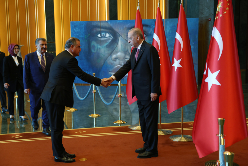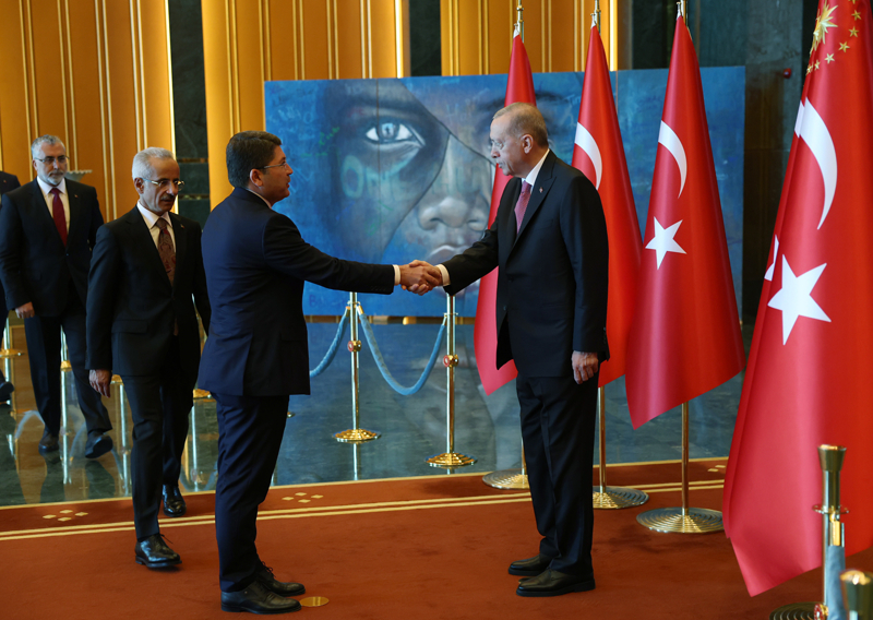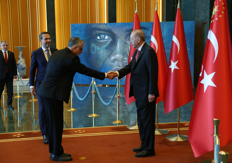Ana bina girişinde düzenlenen törende TBMM Başkanı Numan Kurtulmuş, Cumhurbaşkanı Yardımcısı Cevdet Yılmaz, Anayasa Mahkemesi Başkanı Zühtü Arslan, Yargıtay Başkanı Mehmet Akarca, Danıştay Başkanı Zeki Yiğit, Sayıştay Başkanı Metin Yener, Cumhurbaşkanlığı Kabinesi üyeleri, MHP Genel Başkanı Devlet Bahçeli, Genelkurmay Başkanı Orgeneral Metin Gürak ve kuvvet komutanları, TBMM üyeleri, kamu kurumlarının yöneticilerinin de aralarında olduğu devlet erkanı, yabancı misyon şefleri ile uluslararası kuruluşların temsilcileri Cumhurbaşkanı Erdoğan'a bayram tebriklerini sundu.