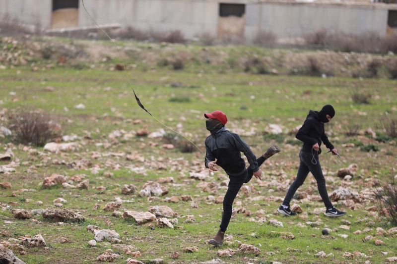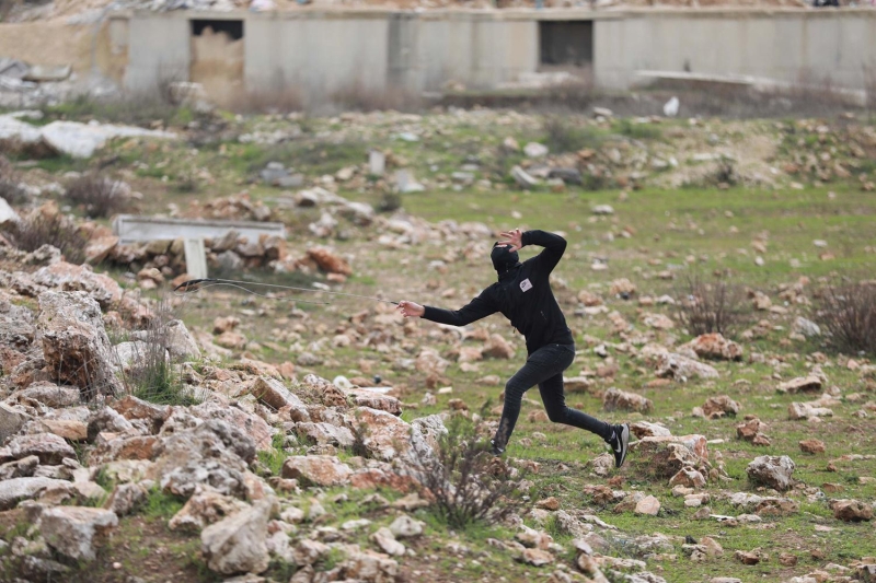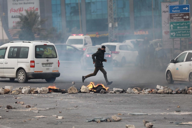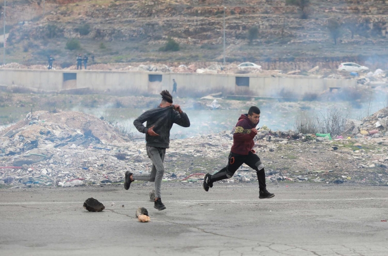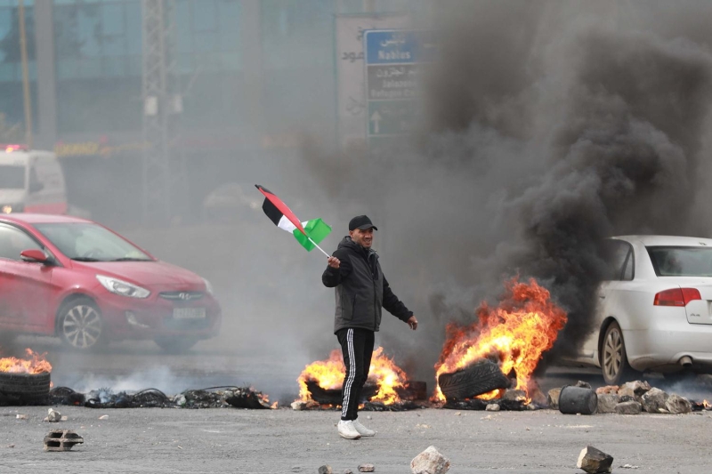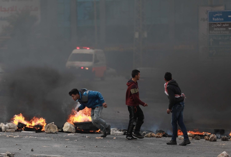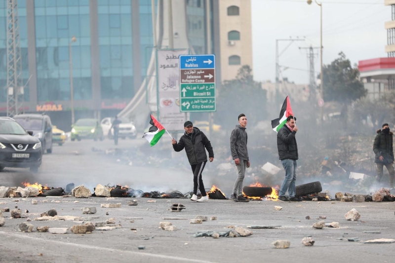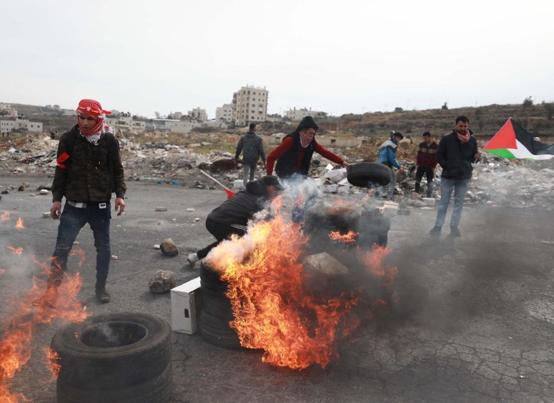 İşgal altındaki Batı Şeria'nın Ramallah kenti girişindeki Beit El kontrol noktası yakınında toplanan Filistinliler, ABD Başkanı Donald Trump'ın açıkladığı sözde barış planını protesto etti.