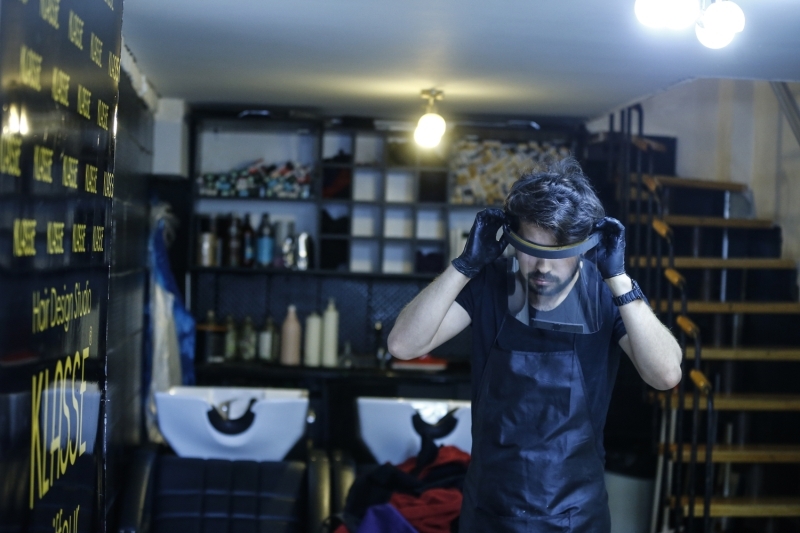 Kırklareli'nde berberlik yapan Barış Tıkılı, siperli maske ve eldiven takarak çalışmaya başladı.