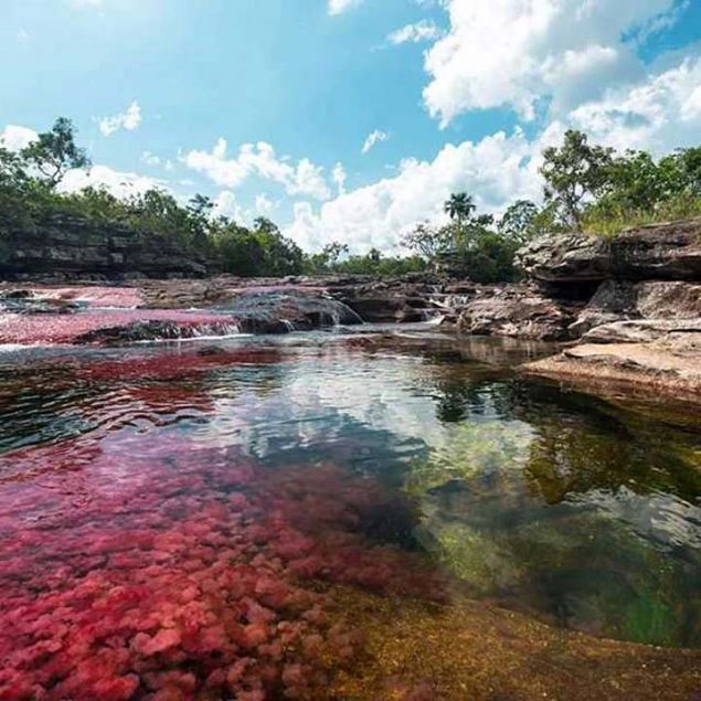 Yaklaşık 100 kilometre uzunluktaki Cano Cristales’teki şelaleler, nehirler ve çaylarda yılın birkaç ayında gözlemlenebilen bir gökkuşağı patlaması yaşanıyor.