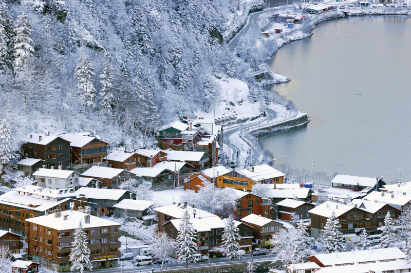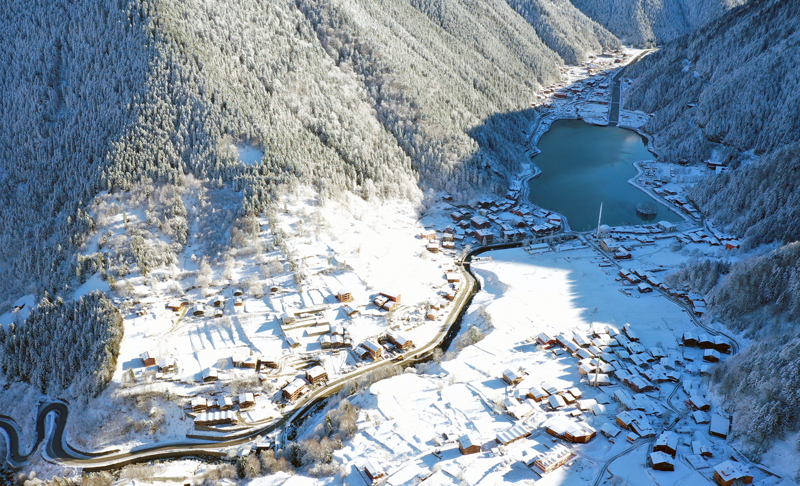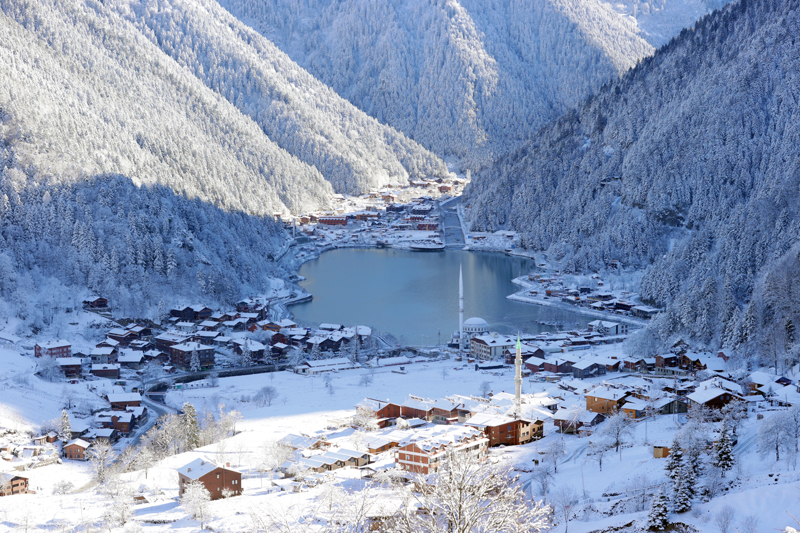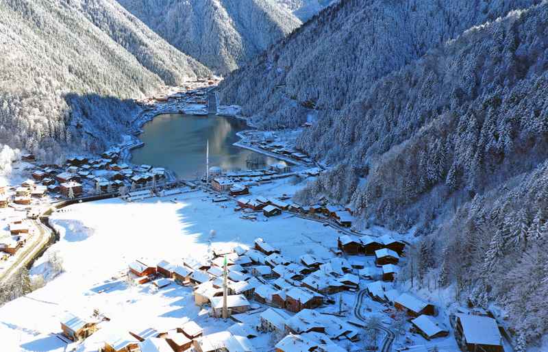 Türkiye'nin önemli turizm merkezlerinden Trabzon'un Çaykara ilçesindeki Uzungöl, kar yağışı sonrası beyaz örtüyle kaplandı.