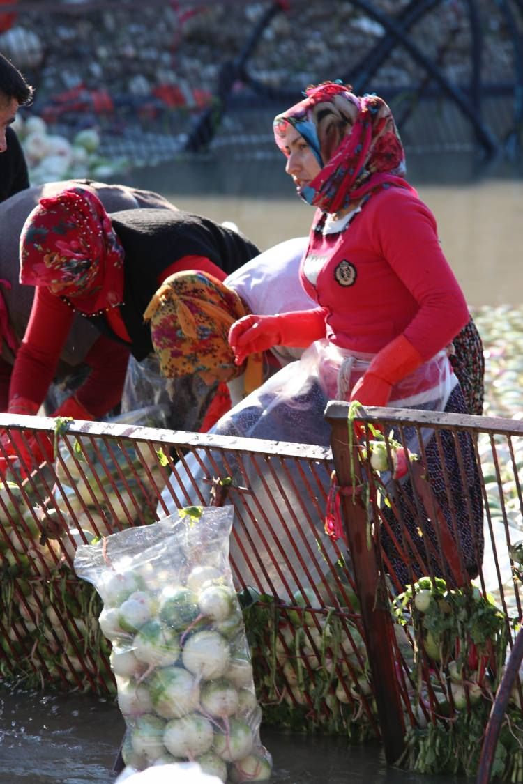 Çoğunluğunu kadınların oluşturduğu işçiler turpları tek tek yıkayarak paketleyip satışa hazır hale getiriyor. Kadınların torbaladığı turplar erkek işçiler tarafından kamyonlara yükleniyor.