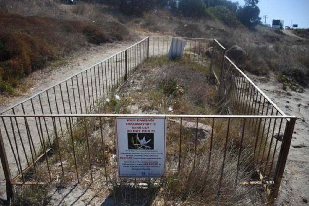 Koparılması ve tahrip edilmesinin önlenmesi amacıyla demir korkuluklarla çevrilen kum zambaklarının bulunduğu alanda 'Kum zambağı koparmayınız' yazılı uyarıları levhaları da yer alıyor.
