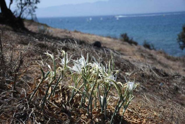 Havaların ısınmasıyla birlikte Bodrum ve Datça kıyılarında açmaya başlayan kum zambağı, ilçede tatilini geçiren yerli ve yabancı turistlerin beğenisini topluyor.
