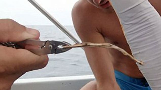 Balıkçılar tarafından güçlükle çıkarılan pipet sonrası kaplumbağanın kanaması da durdurularak kurtarıldı.