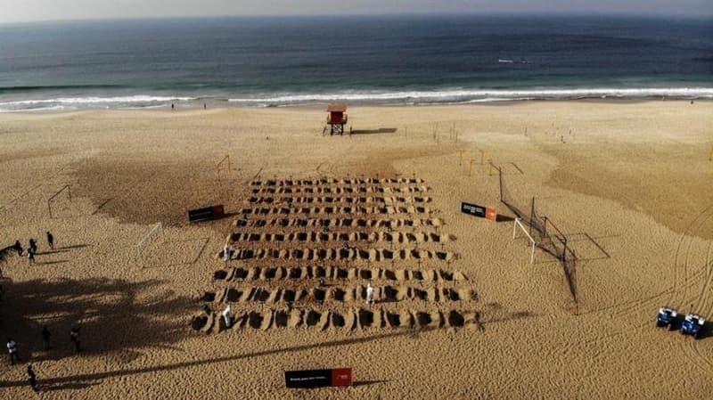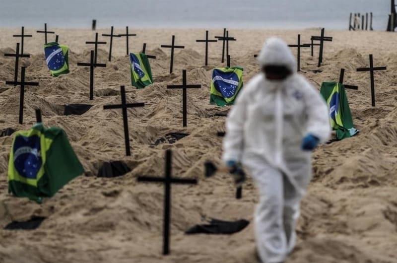 Ülkenin en ünlü plajlarından olan Copacabana plajında hükümetin salgına yönelik mücadelesini protesto etmek amacıyla aktivistler tarafından sembolik mezarlar kazıldı.