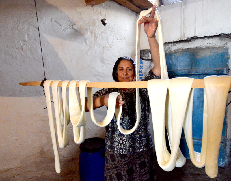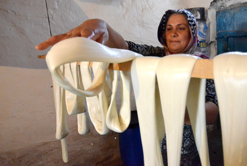 Ardından ekşiyen süte aynı miktarda taze süt ekleyen kadınlar mayaladıktan sonra ateşte pişirme ve yoğurma işlemi yapıyor.