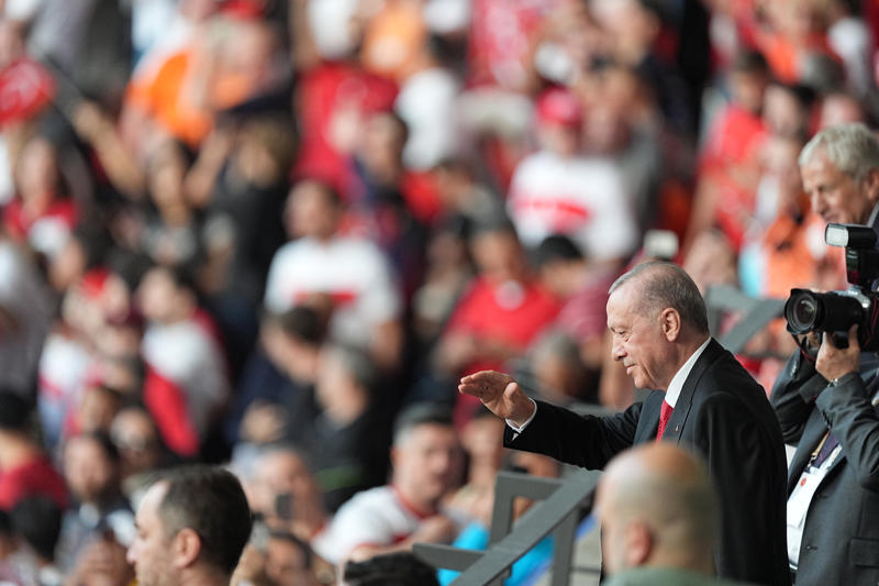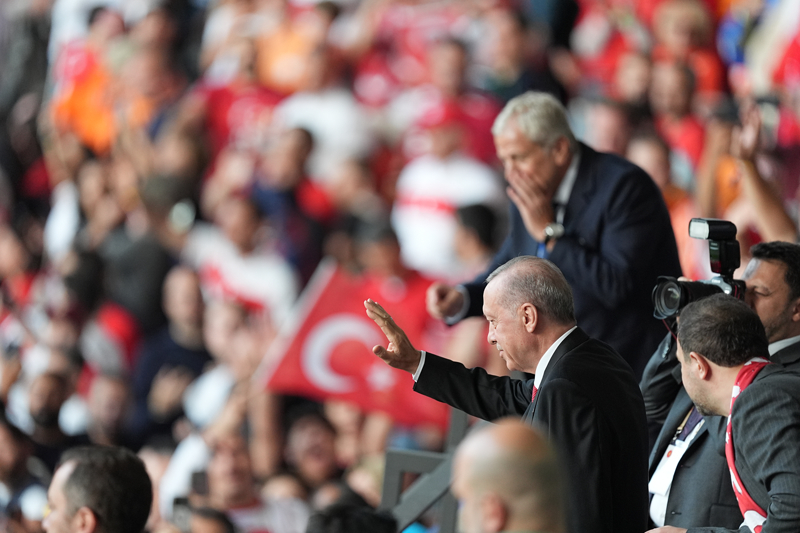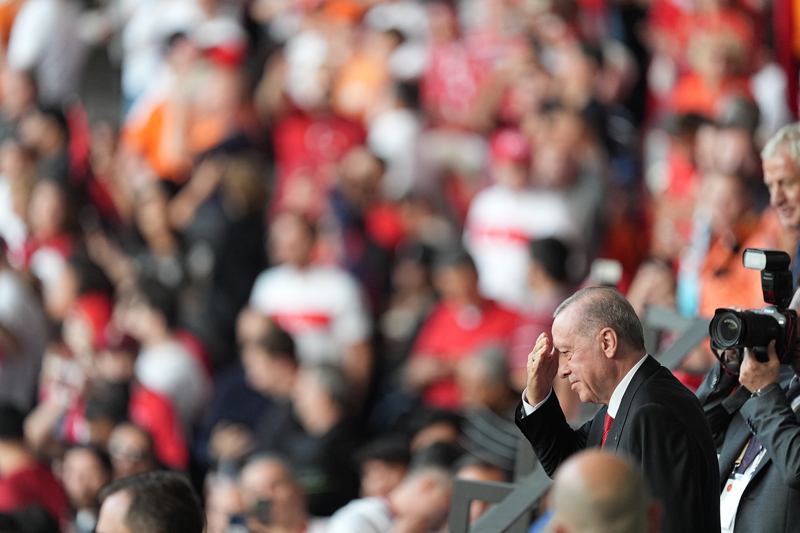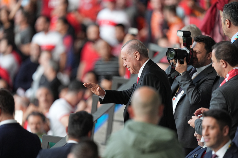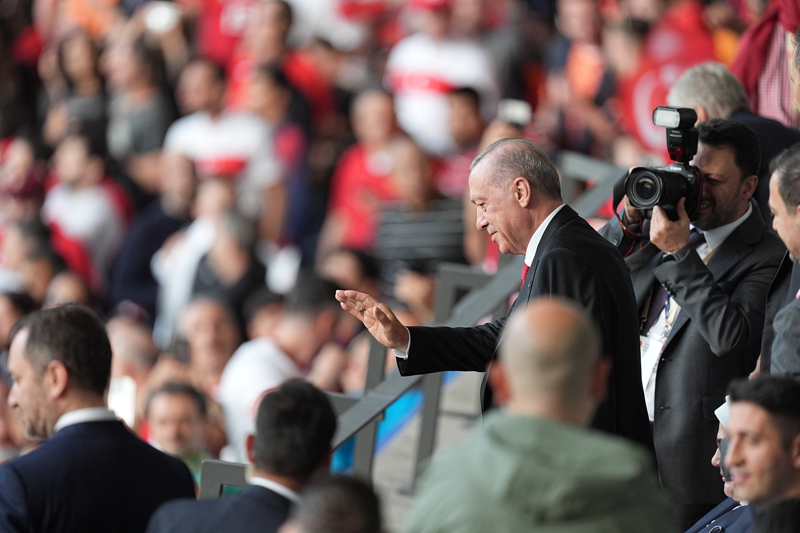 Protokol tribününe gelişi sırasında Türk taraftarlar, Cumhurbaşkanı Erdoğan'a sevgi gösterisinde bulundu. Erdoğan da taraftarlara selamlayarak karşılık verdi.