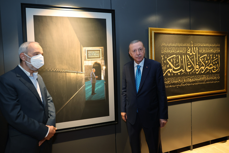Cumhurbaşkanı Recep Tayyip Erdoğan, Cumhurbaşkanlığı Millet Kütüphanesi Davet Kabul Salonu'nda, Ayasofya-i Kebir Cami-i Şerifi'nin yeniden ibadete açılmasının ardından, fotoğraf sanatçıları İzzet Keribar ve Mehmet Özçay'ın çektiği fotoğraflardan oluşan 'Ayasofya Fotoğrafları' sergisi'ni ziyaret etti.