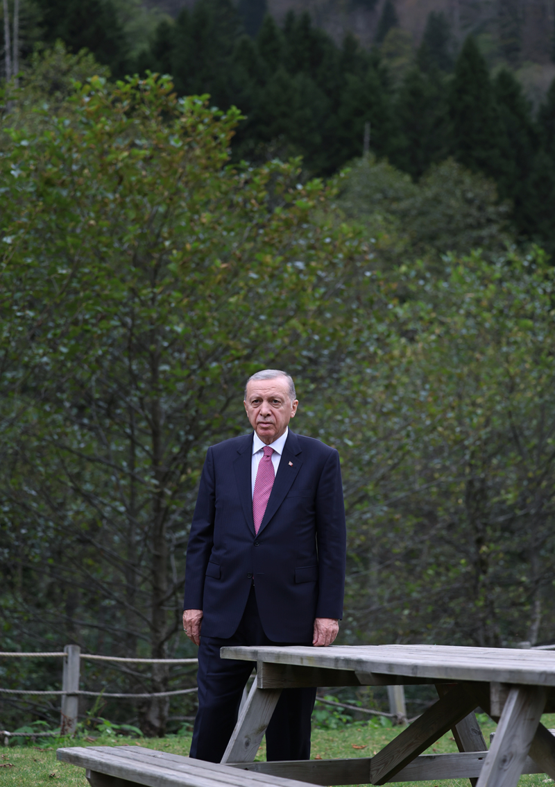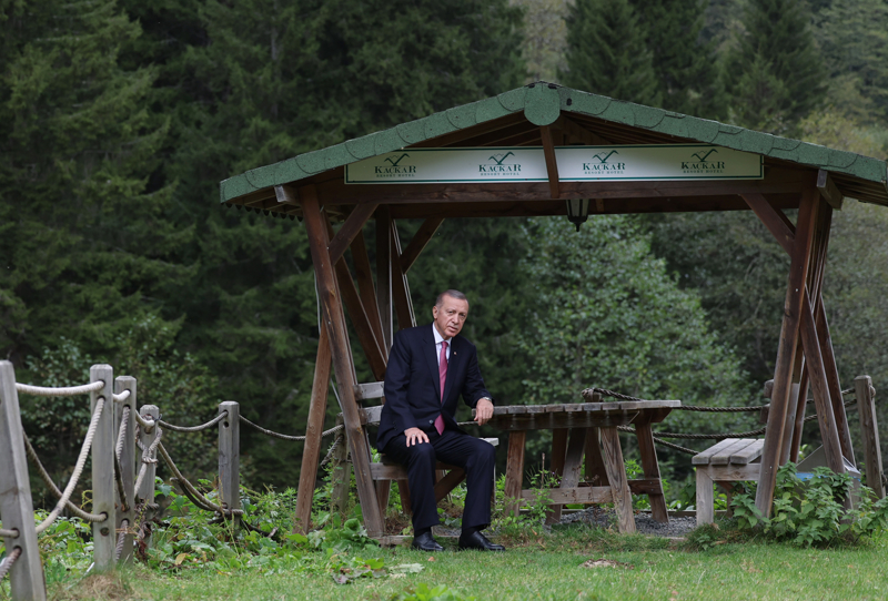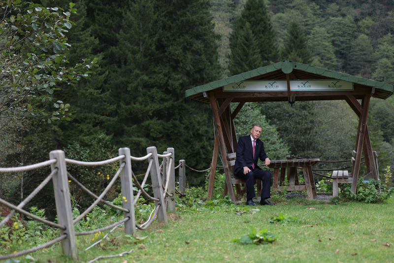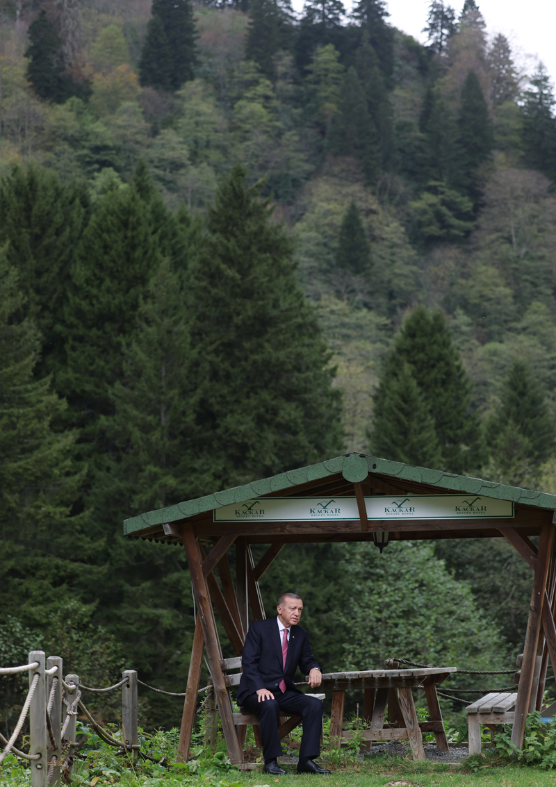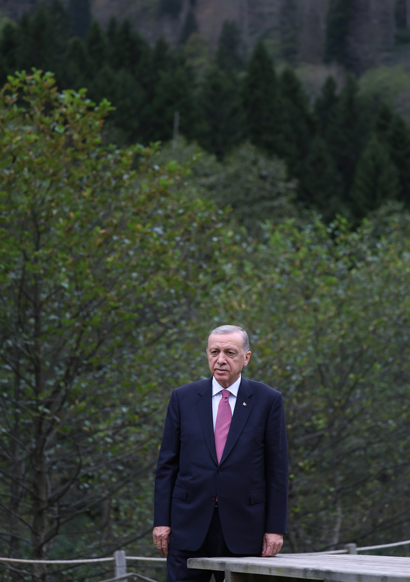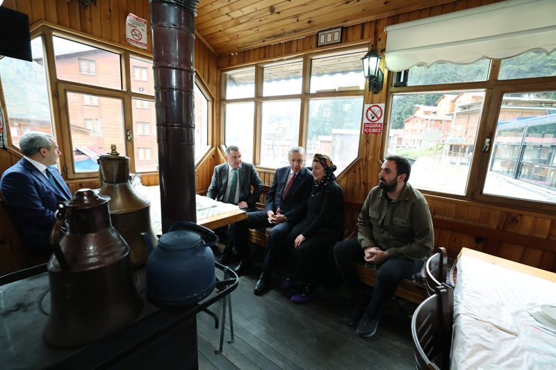Güneysu ilçesinden helikopterle Ayder Yaylası'na gelen Erdoğan, bölgede yapılan yenileme ve koruma çalışmalarını bir süre havadan inceledi.