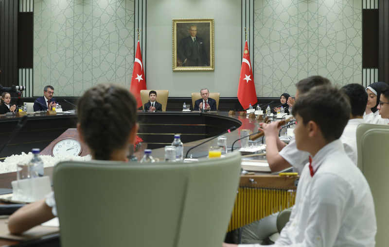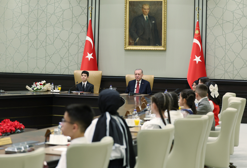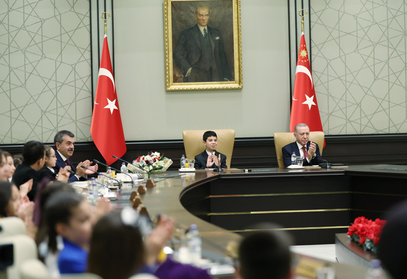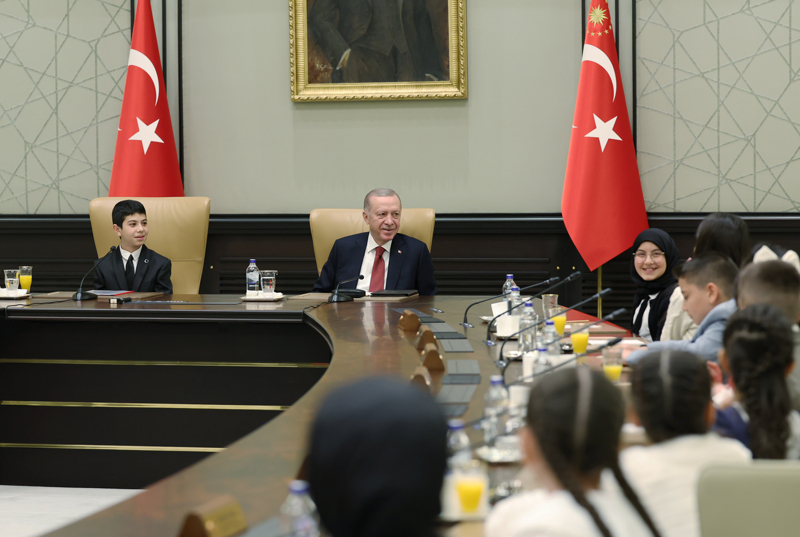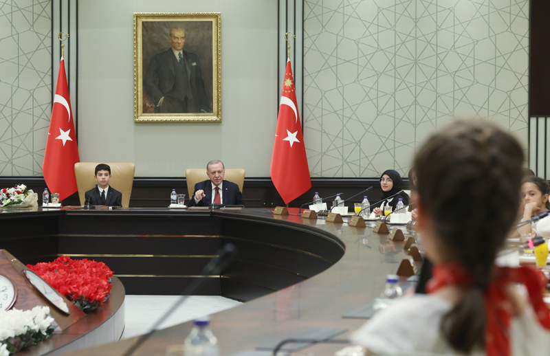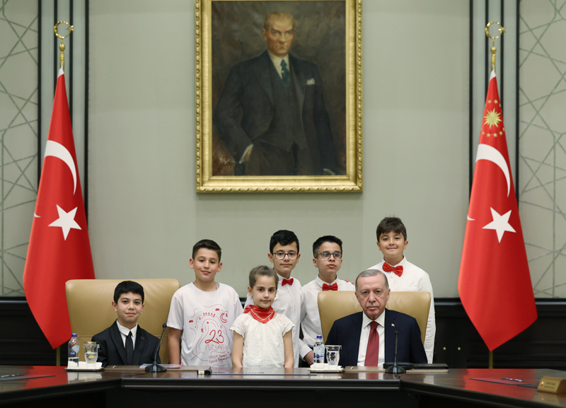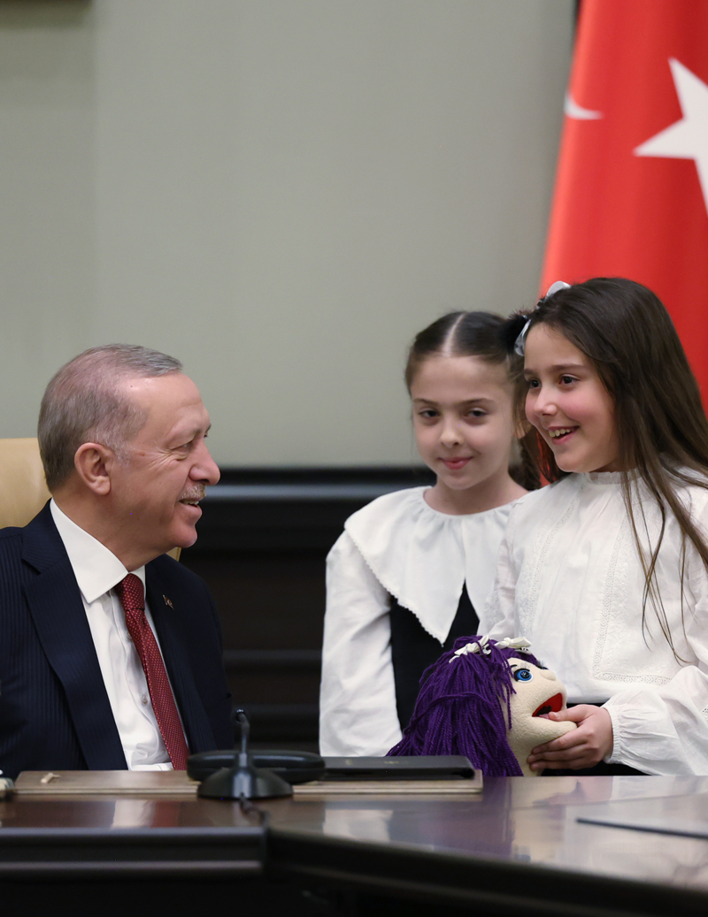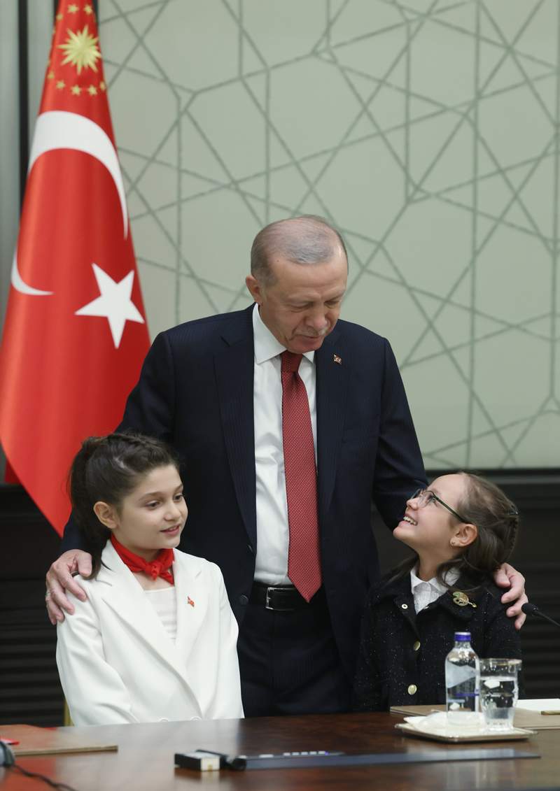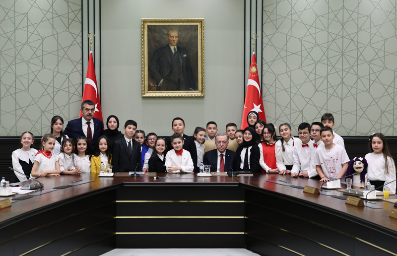 Cumhurbaşkanı Erdoğan, 23 Nisan Ulusal Egemenlik ve Çocuk Bayramı dolayısıyla Cumhurbaşkanlığı Külliyesi'nde kabine toplantısının yapıldığı salonda Bakan Tekin ve beraberindeki çocukları kabul etti.
