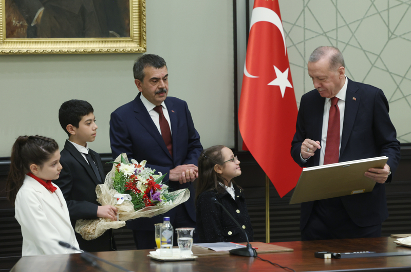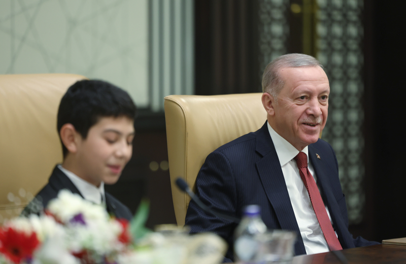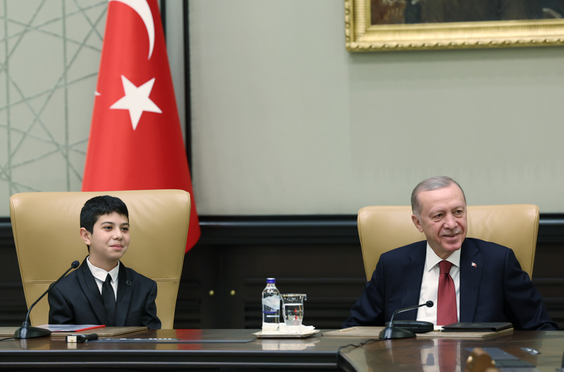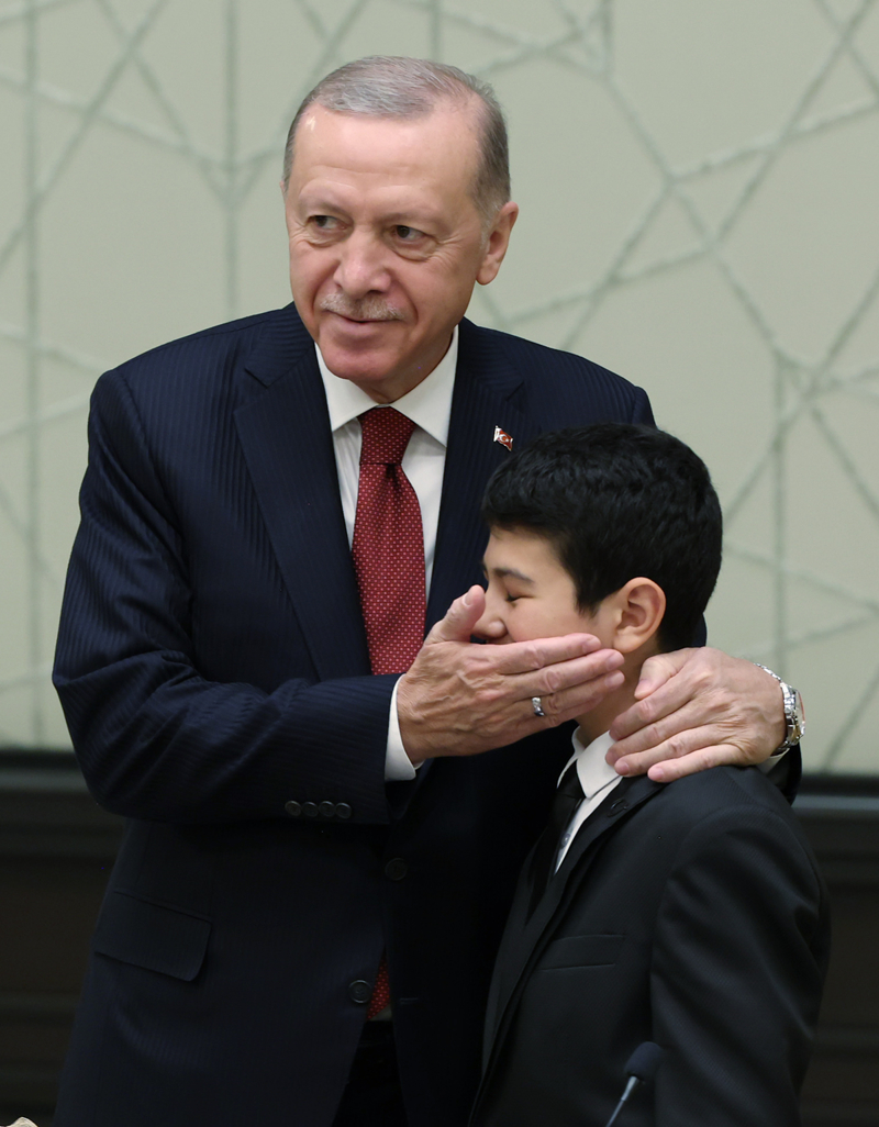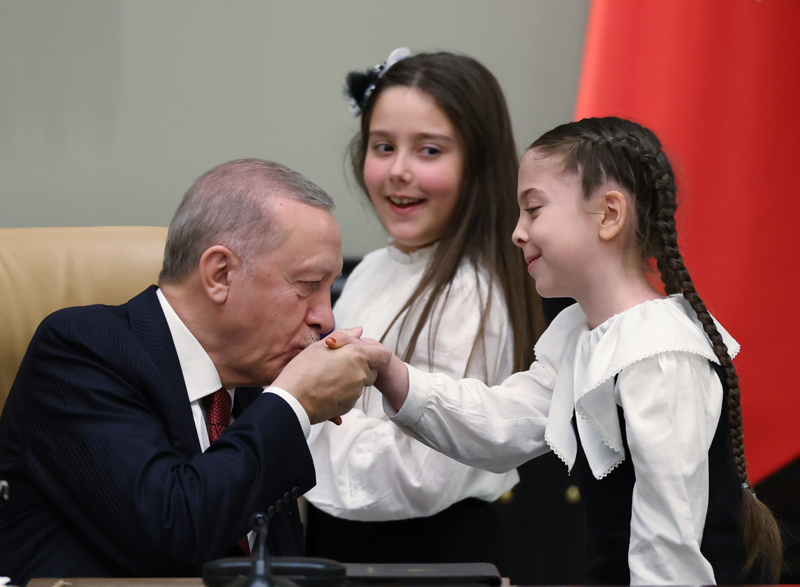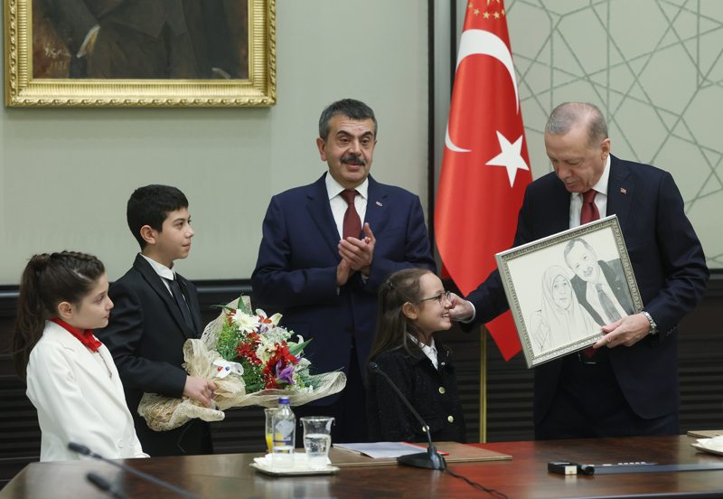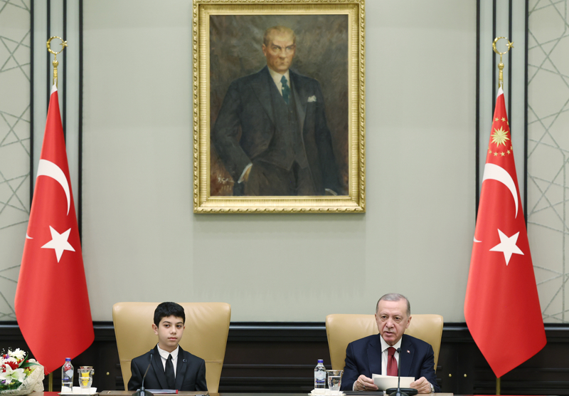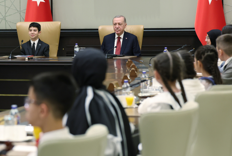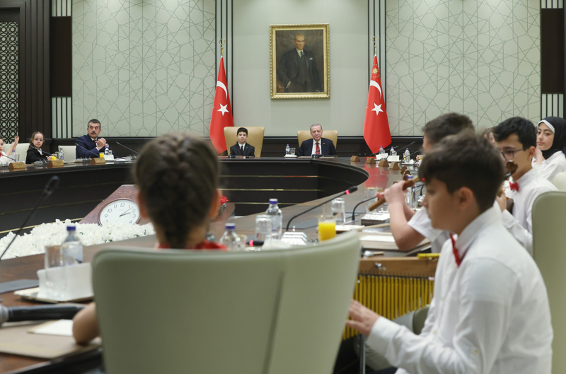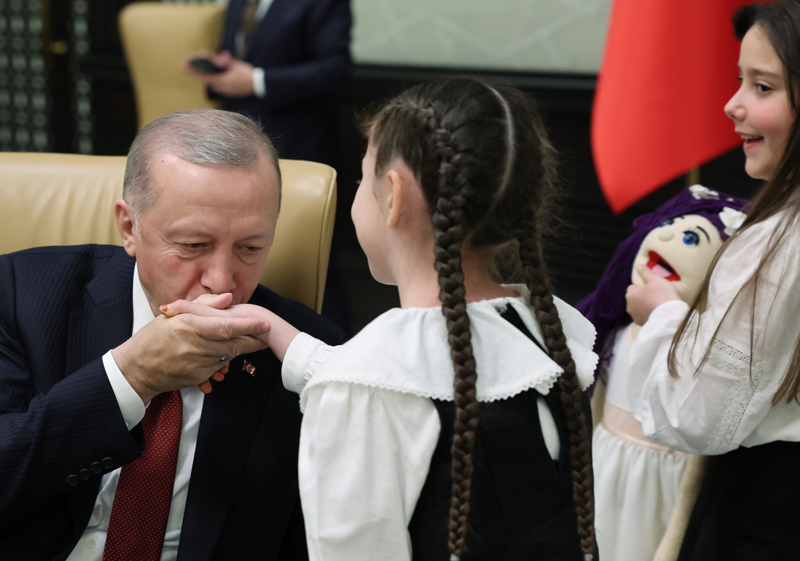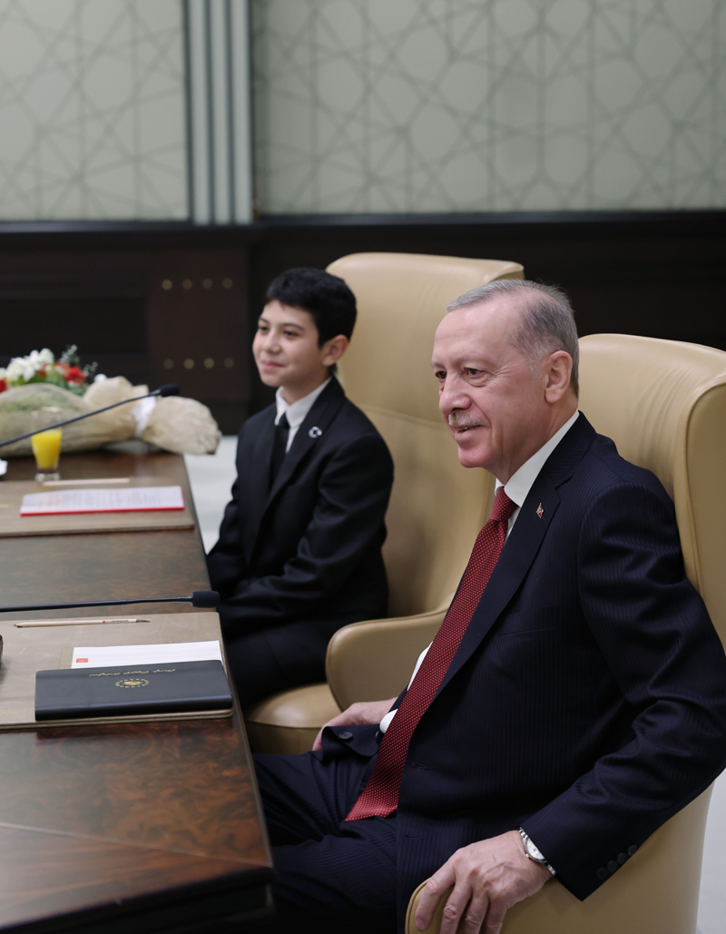 Cumhurbaşkanı Erdoğan, 23 Nisan Ulusal Egemenlik ve Çocuk Bayramı dolayısıyla Cumhurbaşkanlığı Külliyesi'nde kabine toplantısının yapıldığı salonda Bakan Tekin ve beraberindeki çocukları kabul etti.