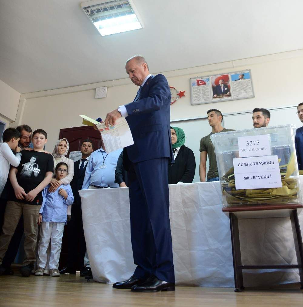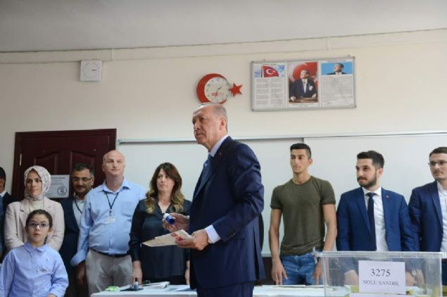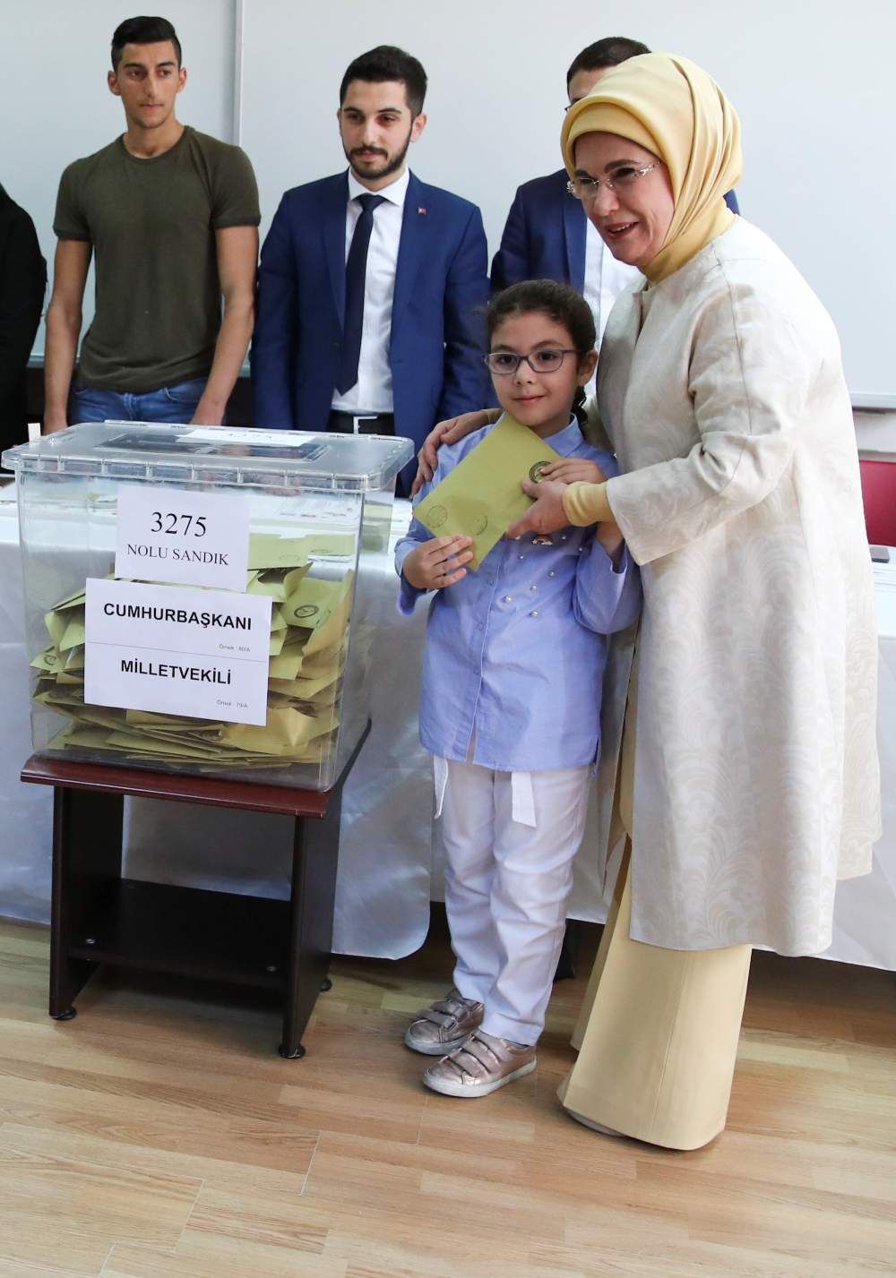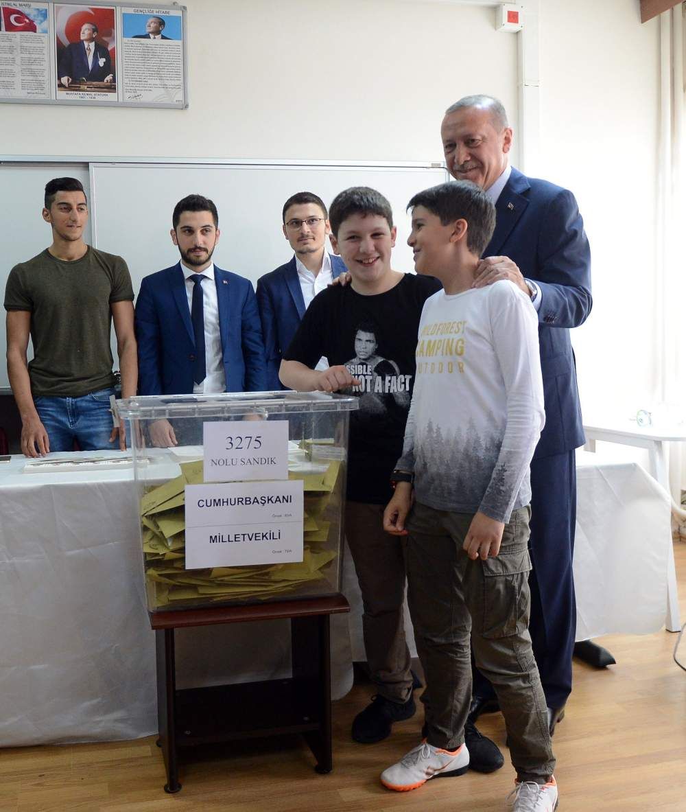 Erdoğan sandık görevlileriyle tek tek tokalaştıktan sonra mühür ve pusulayı aldı. Önce Emine Erdoğan daha sonra Cumhurbaşkanı Erdoğan oy kullandı. Emine Erdoğan zarfını torunu Mahinur Albayrak ile birlikte sandığa attı. Cumhurbaşkanı Erdoğan ise 3275 numaralı sandığa torunları Ömer Tayyip Erdoğan ve Ahmet Akif Albayrak ile birlikte 'Hayırlı olsun' diyerek zarfı attı. 'Miletimiz için ülkemiz için hayırlı olsun' diyen Erdoğan, 'Öncelikle sandık kurulumuzun üyelerine teşekkür ediyorum ve az önce de öğrendiğim kadarıyla şu an itibariyle 150'yi aşkın bir seçmenin oy kullandığını öğrendik. Demek ki katılım iyi görünüyor. Türkiye genelinde de bunu gösteriyor. Dünyada en gelişmiş ülkelerde bile yüzde 30'lara düşen bir katılımın olduğu seçimlerde Türkiye bunların hepsini aşmış vaziyette.