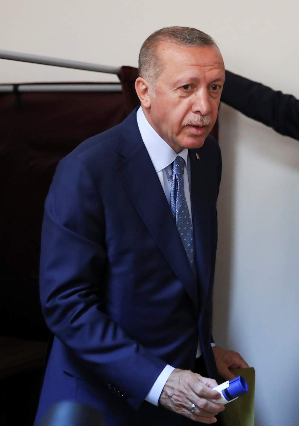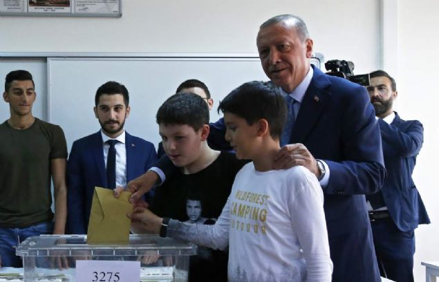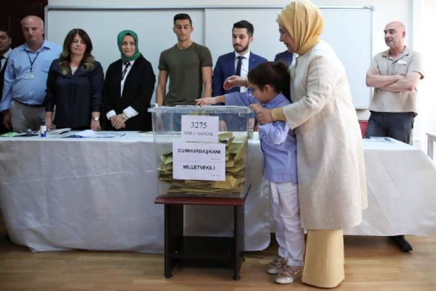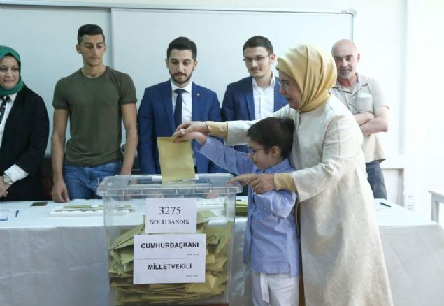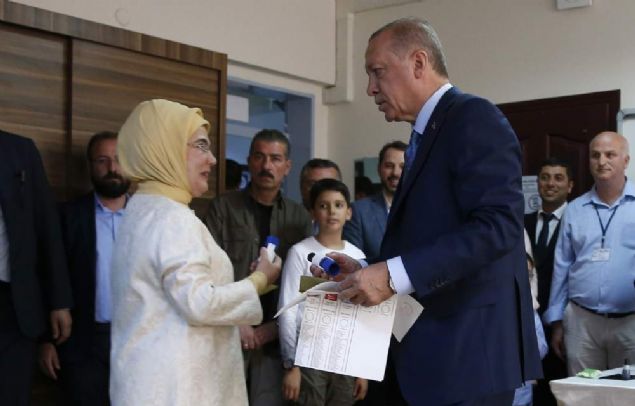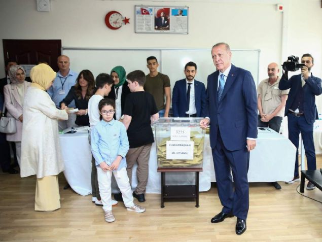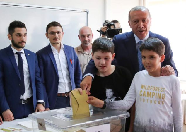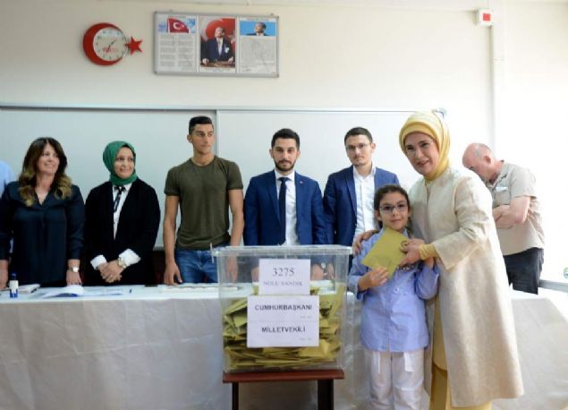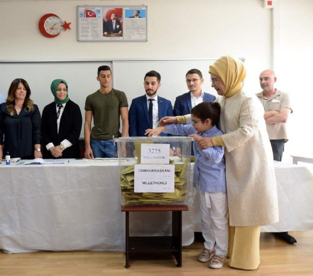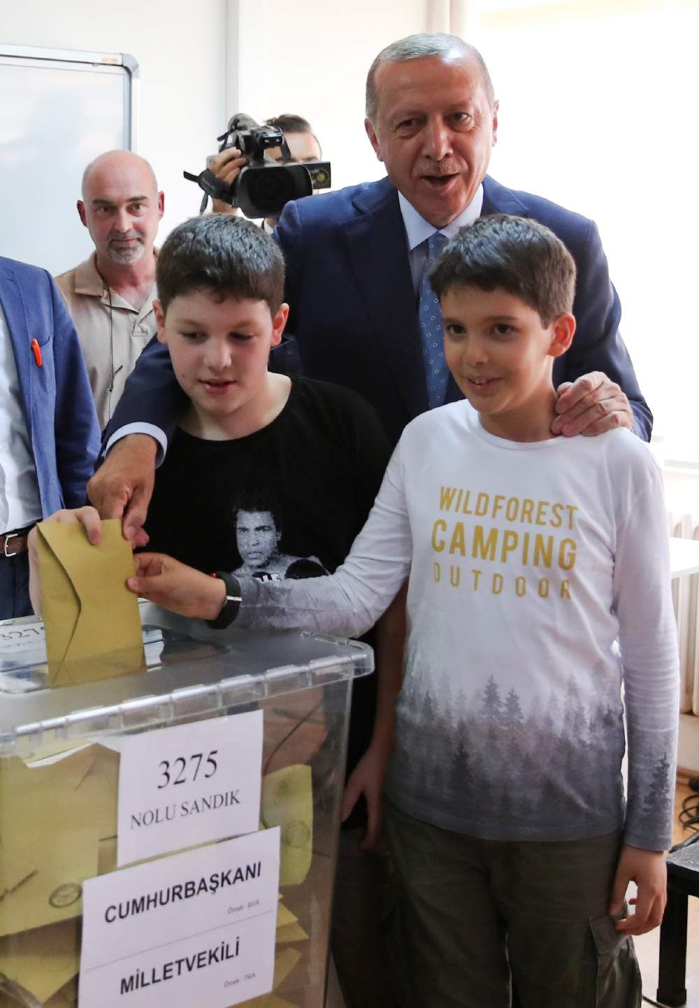 Erdoğan sandık görevlileriyle tek tek tokalaştıktan sonra mühür ve pusulayı aldı. Önce Emine Erdoğan daha sonra Cumhurbaşkanı Erdoğan oy kullandı. Emine Erdoğan zarfını torunu Mahinur Albayrak ile birlikte sandığa attı. Cumhurbaşkanı Erdoğan ise 3275 numaralı sandığa torunları Ömer Tayyip Erdoğan ve Ahmet Akif Albayrak ile birlikte 'Hayırlı olsun' diyerek zarfı attı. 'Miletimiz için ülkemiz için hayırlı olsun' diyen Erdoğan, 'Öncelikle sandık kurulumuzun üyelerine teşekkür ediyorum ve az önce de öğrendiğim kadarıyla şu an itibariyle 150'yi aşkın bir seçmenin oy kullandığını öğrendik. Demek ki katılım iyi görünüyor. Türkiye genelinde de bunu gösteriyor. Dünyada en gelişmiş ülkelerde bile yüzde 30'lara düşen bir katılımın olduğu seçimlerde Türkiye bunların hepsini aşmış vaziyette.