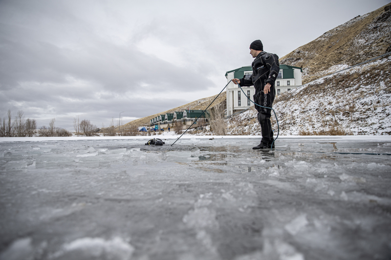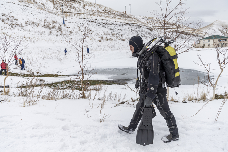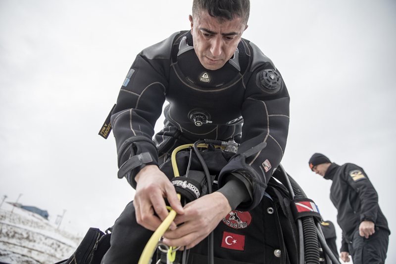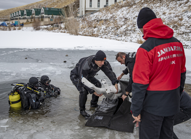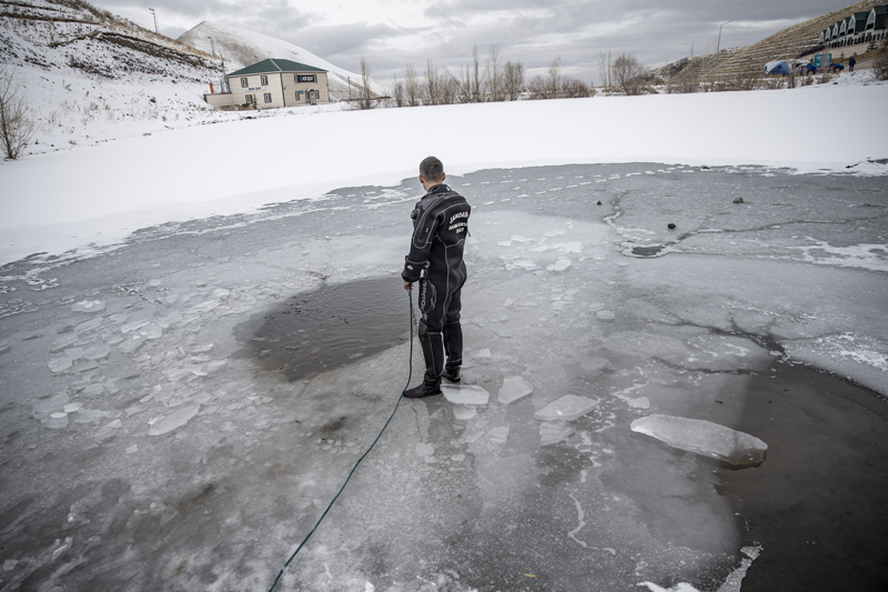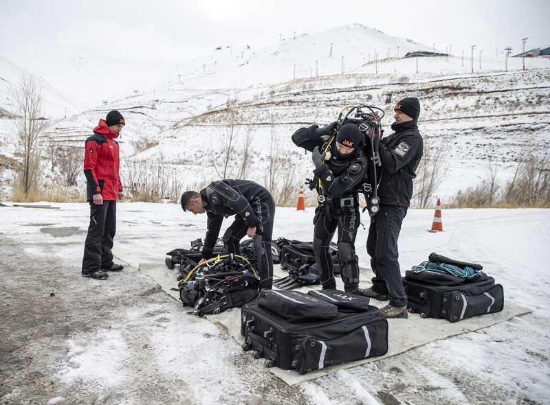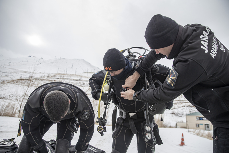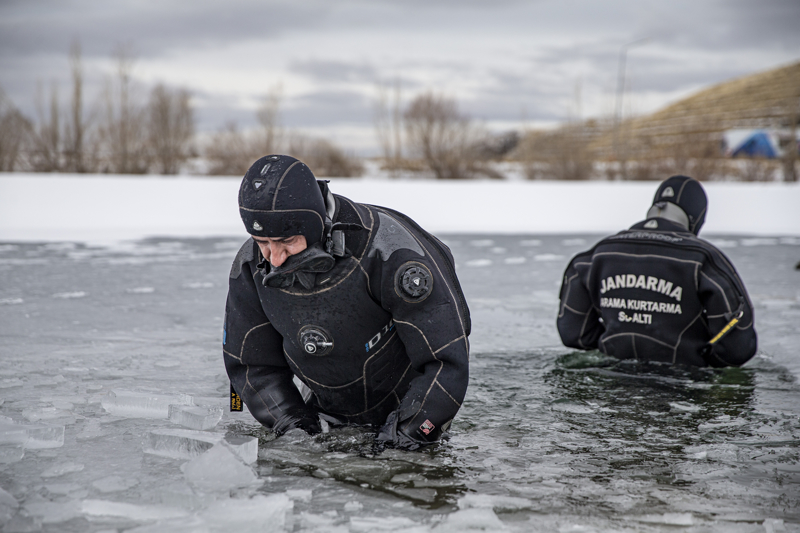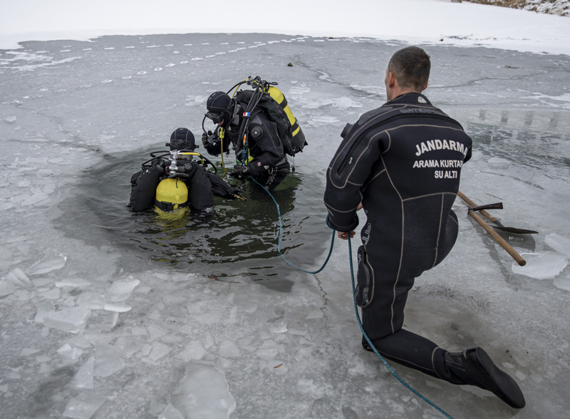 Erzurum Jandarma Komutanlığına bağlı komandolardan oluşan Sualtı Arama Kurtarma (SAK) timleri, kışın yaşanabilecek kayıp vakalarına karşı zorlu eğitimlerle hazırlık yapıyor. SAK timleri, dondurucu soğukta, zorlu arazi ve hava koşullarına karşı 'daima hazır' olmak için düzenli olarak yaptıkları tatbikatlar kapsamında, bu kez Palandöken Dağı eteklerindeki 2700 rakımda bulunan, buzla kaplı, 22 metre derinliğindeki gölete dalış yaptı.