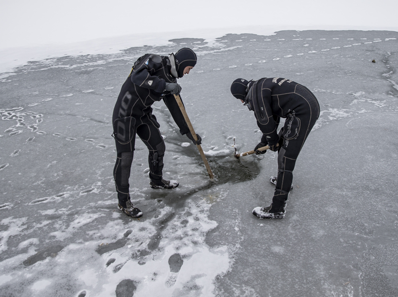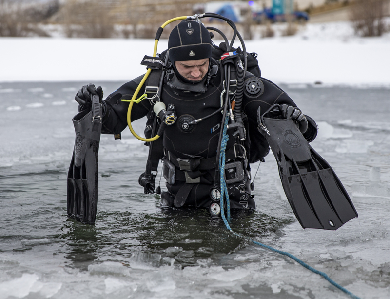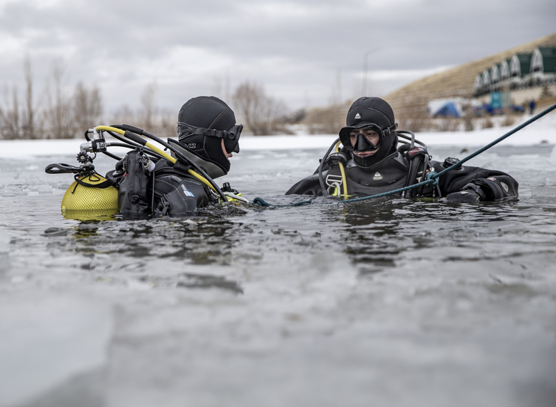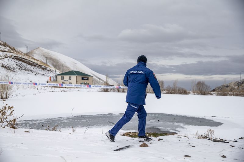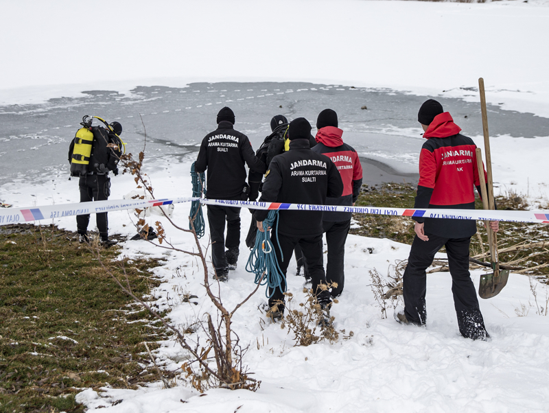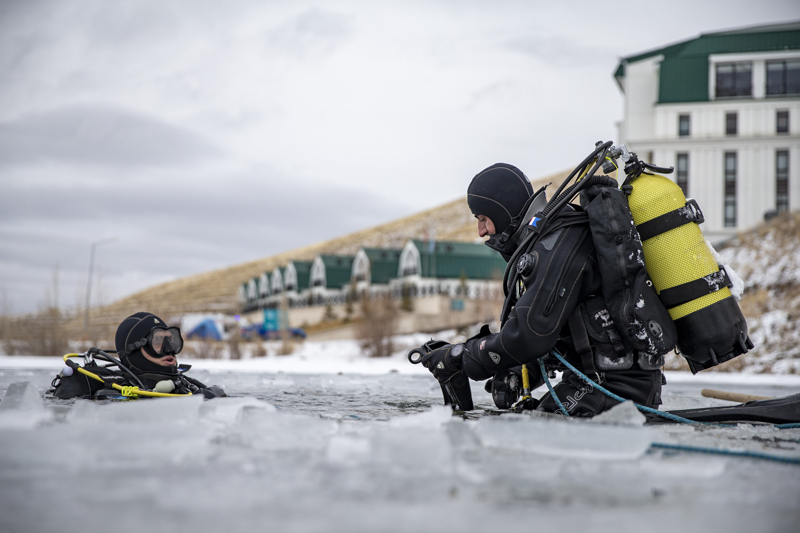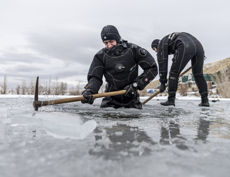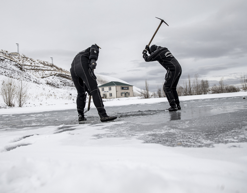 Erzurum Jandarma Komutanlığına bağlı komandolardan oluşan Sualtı Arama Kurtarma (SAK) timleri, kışın yaşanabilecek kayıp vakalarına karşı zorlu eğitimlerle hazırlık yapıyor. SAK timleri, dondurucu soğukta, zorlu arazi ve hava koşullarına karşı 'daima hazır' olmak için düzenli olarak yaptıkları tatbikatlar kapsamında, bu kez Palandöken Dağı eteklerindeki 2700 rakımda bulunan, buzla kaplı, 22 metre derinliğindeki gölete dalış yaptı.
