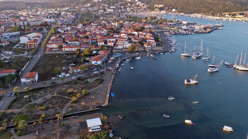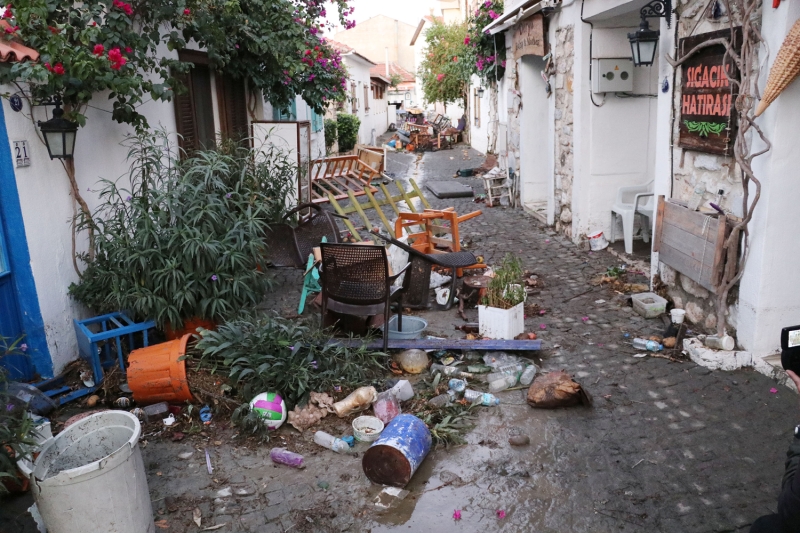 İlçenin önemli turistik bölgesi Sığacık Mahallesi'ndeki birçok iş yerinin masa ve sandalyeleri sulara kapıldı.