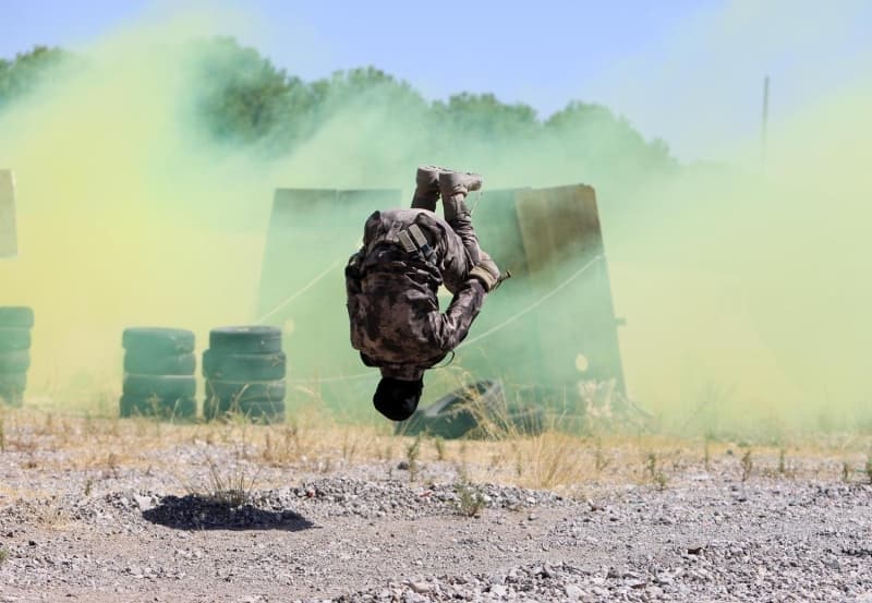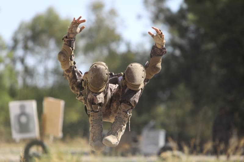 İkinci adımda ise akrobatik hareketlerle hedeften çıkan polisler, düşman unsurunun etkisiz hale getirilmesini canlandırdı.