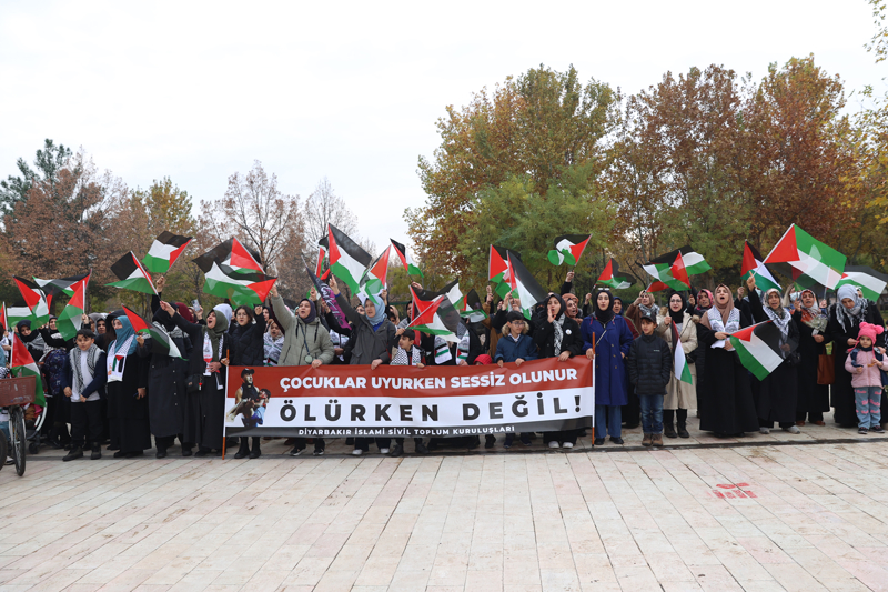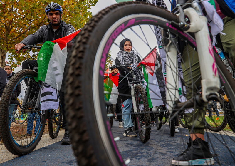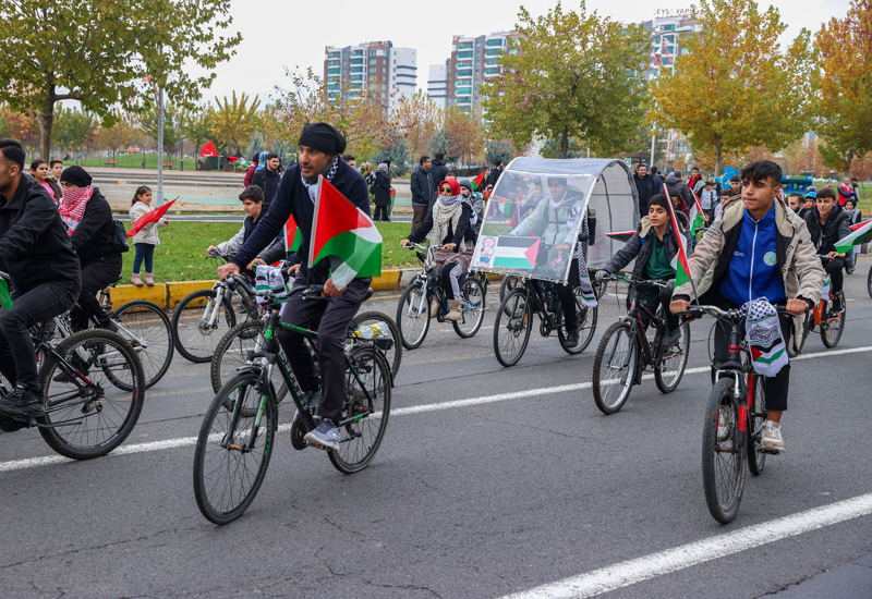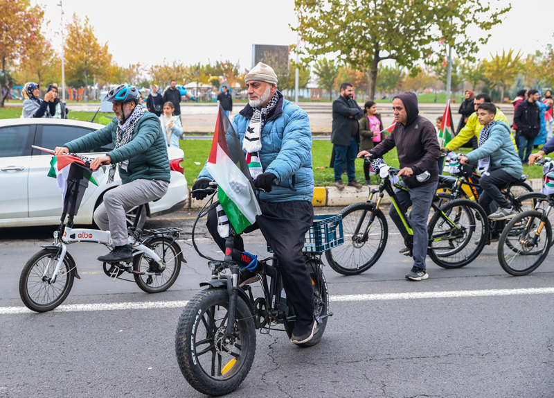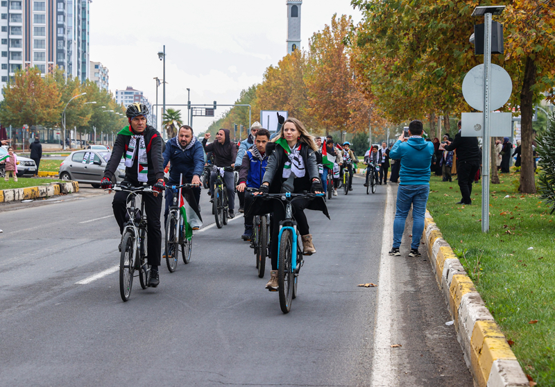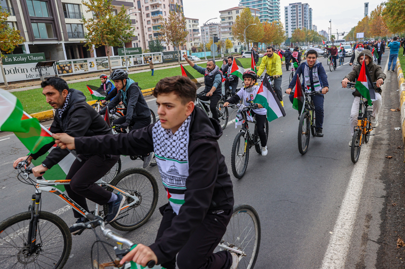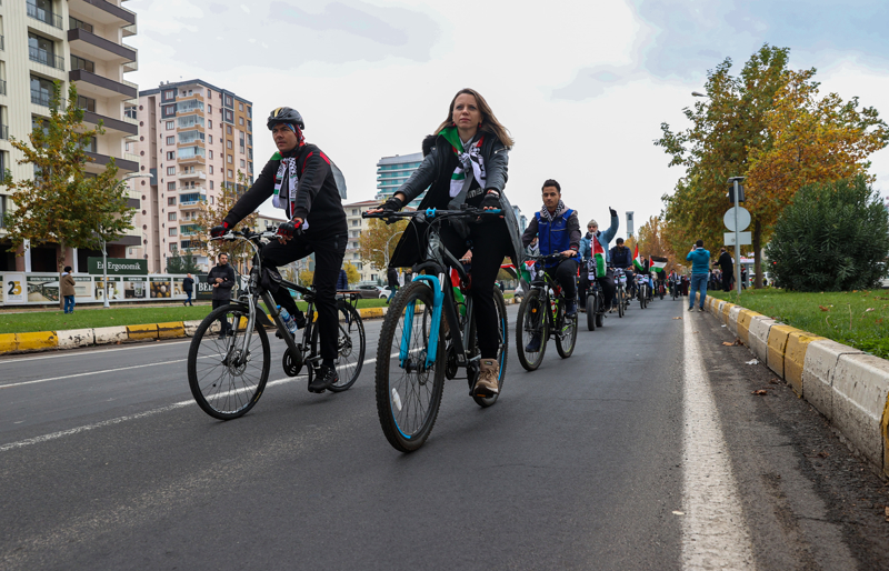 Diyarbakır'da düzenlenen 'Pedallarımızı Gazze için çeviriyoruz' bisiklet turu etkinliğinde Filistin ve Türk bayraklarıyla süsleyen katılımcılar pedal çevirdi.