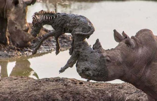 Çamura saplanmış zebra yavrusu kurtarmak isteyen su aygırı zebrayı boynuzlarıyla havaya kaldırarak çamurdan kurtarıyor fakat...