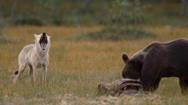 Avı gören kurtlar, ani bir saldırıyla ayının avını elinden almaya çalıştı...
