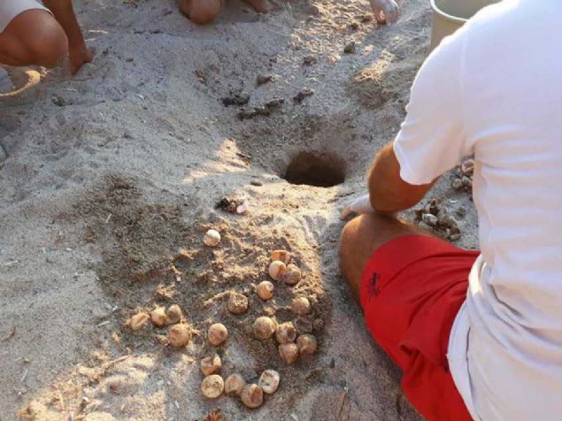 Bir kaplumbağa yuvası daha bulan yetkililer yuvanın etrafını şezlonglarla çevirdi. Hızlı bir şekilde harekete geçen DEKAMER ve AKUT ekipleri caretta carettaları kumun altından yavaş bir şekilde çıkarmaya başladı.