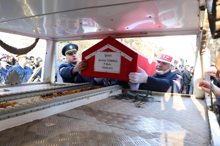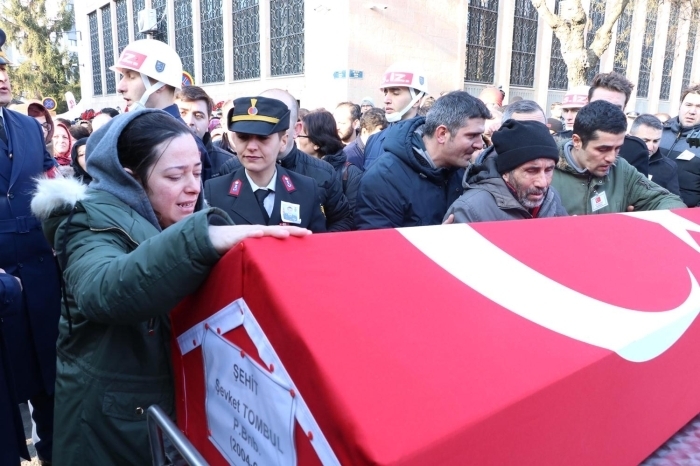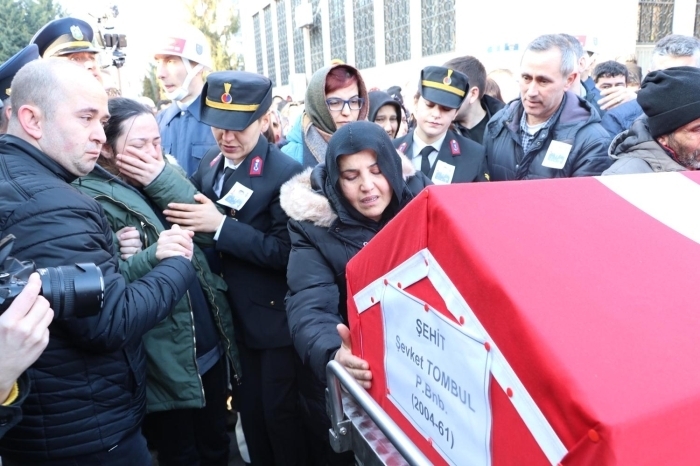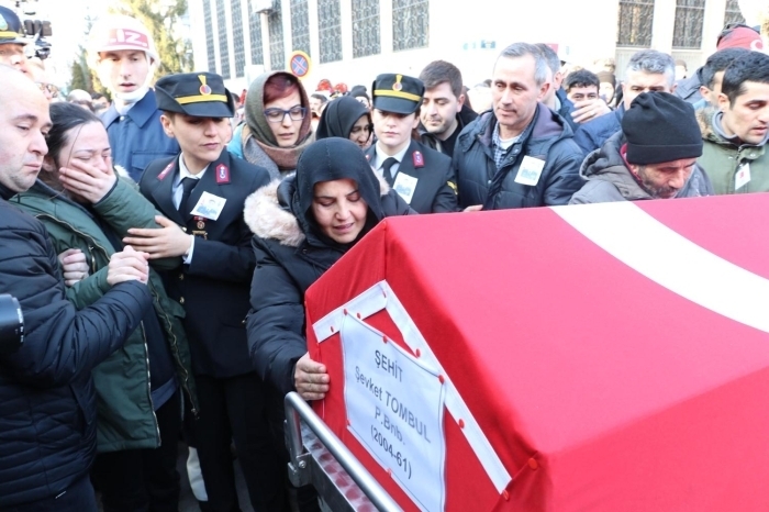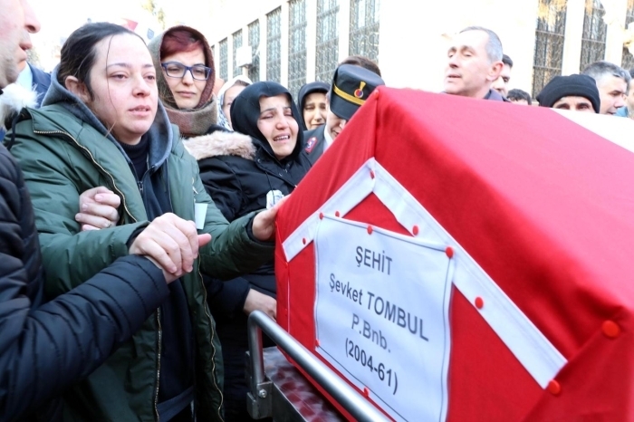 Bu sırada tabuta sarılan şehidin eşi Aslıhan Tombul ve ablası Şefika Duman, "Kahramanım benim" diyerek, gözyaşı döktü.