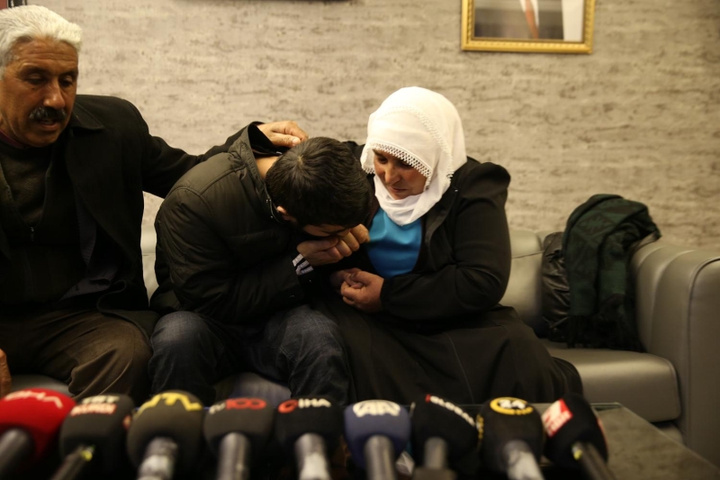 Diyarbakır'da HDP il binası önünde oturma eylemi yapan bir aile daha güvenlik güçlerine teslim olan oğluna kavuştu (AA)