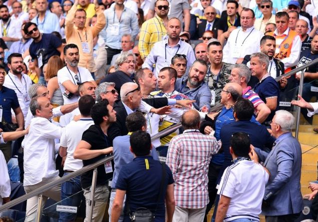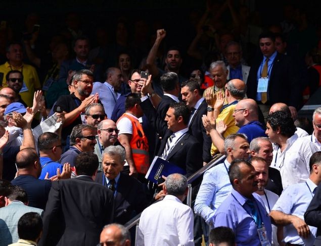 Divan Kurulu Başkanı Vefa Küçük, tarafları sakinleştirmeye çalışsa da bu pek mümkün olmadı. Tribünde bulunan Başkan Adayı Ali Koç da, gerginleşen tribüne gelerek sakin olmalarını istedi.