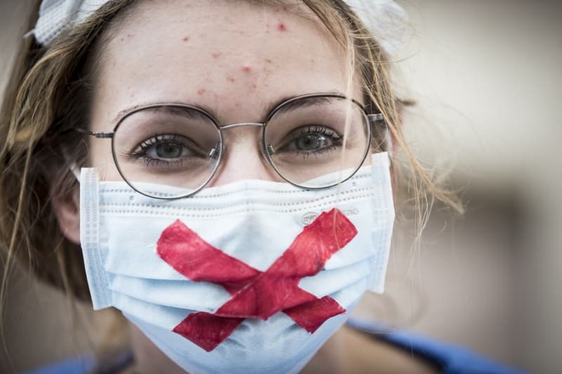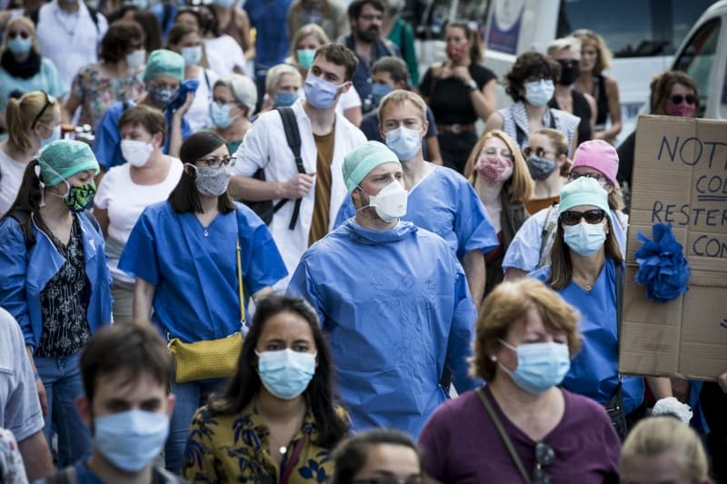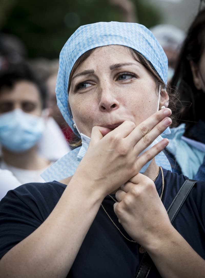 Çalışma koşullarının ve hastanelerdeki imkanların iyileştirilmesini talep eden eylemciler, yeni tip koronavirüs (Kovid-19) salgınını iyi yönetmediği gerekçesiyle hükümete tepki gösterdi.