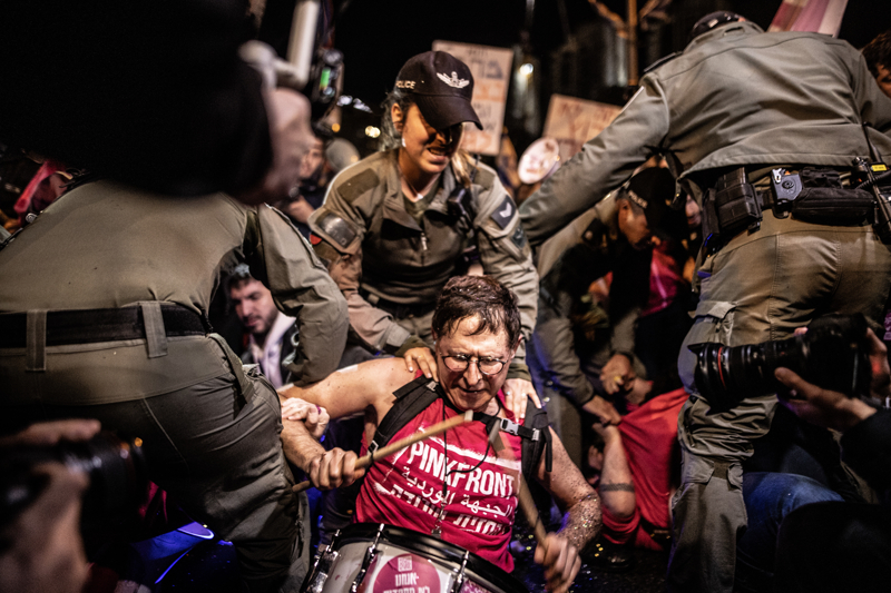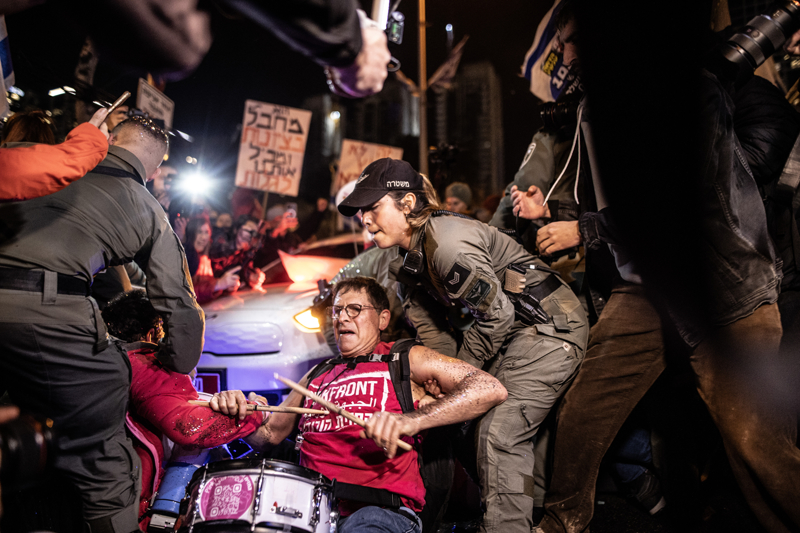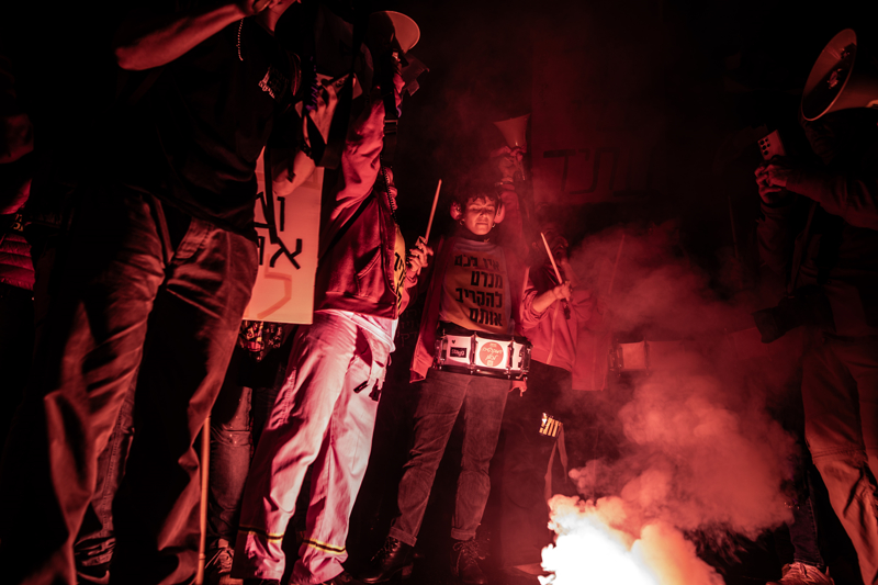 Göstericiler, hoparlörlerden Netanyahu hükümeti aleyhine slogan attı, müzik aletleriyle ritim tuttu.