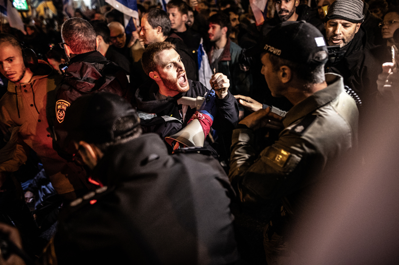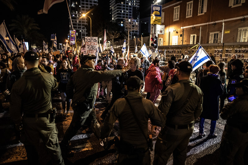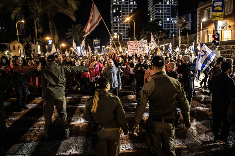 Başkent Tel Aviv'de Savunma Bakanlığı binası önündeki Eliezer Kaplan Caddesi'nde toplanan binlerce gösterici, İsrail bayrakları ve Netanyahu hükümetini eleştiren, pankart, afiş ve dövizler taşıdı.