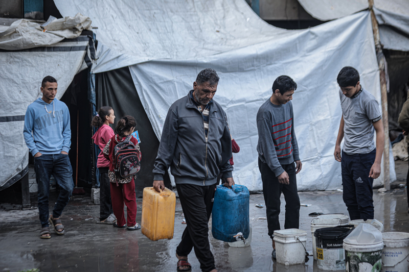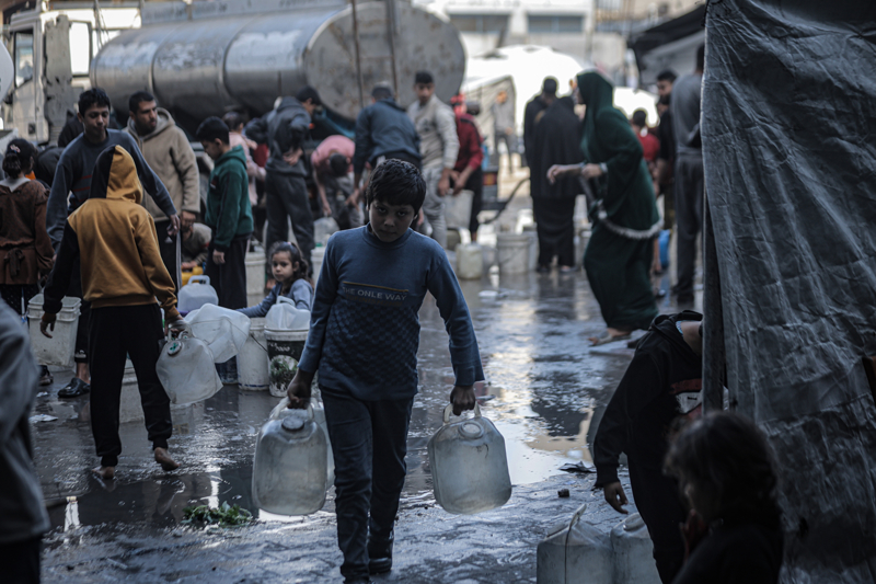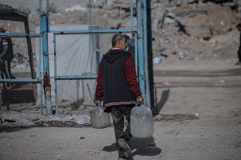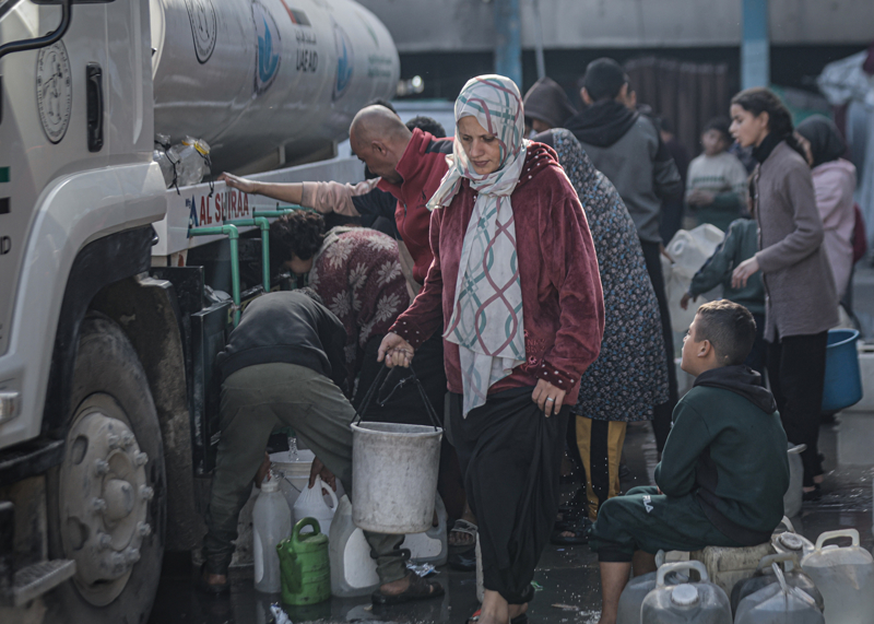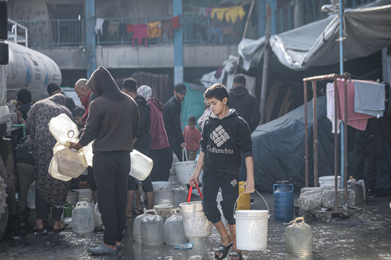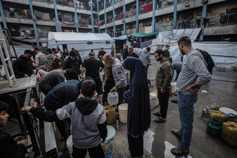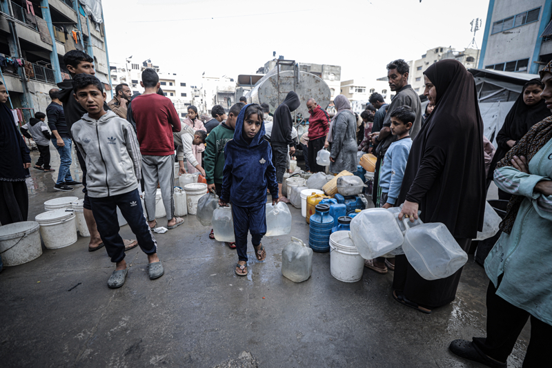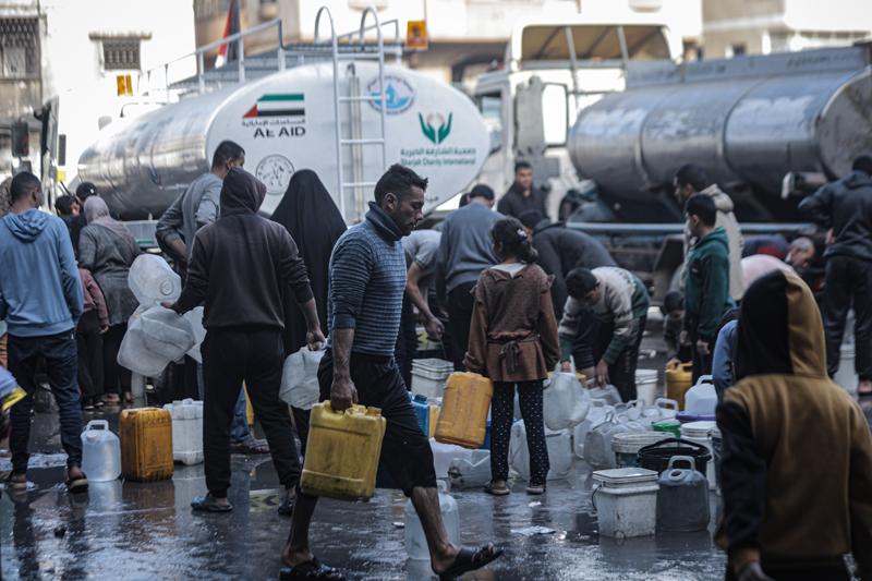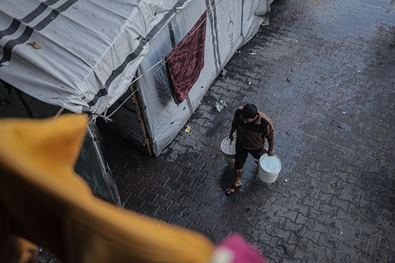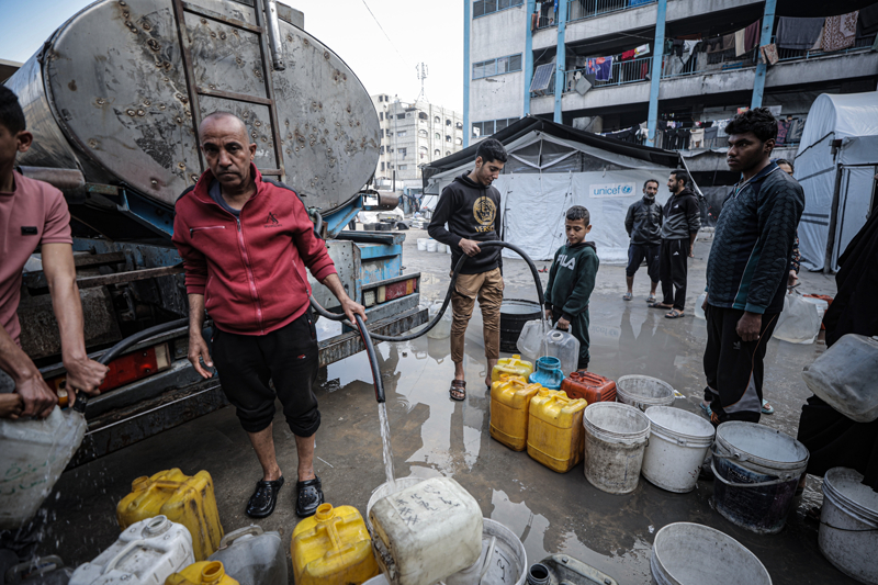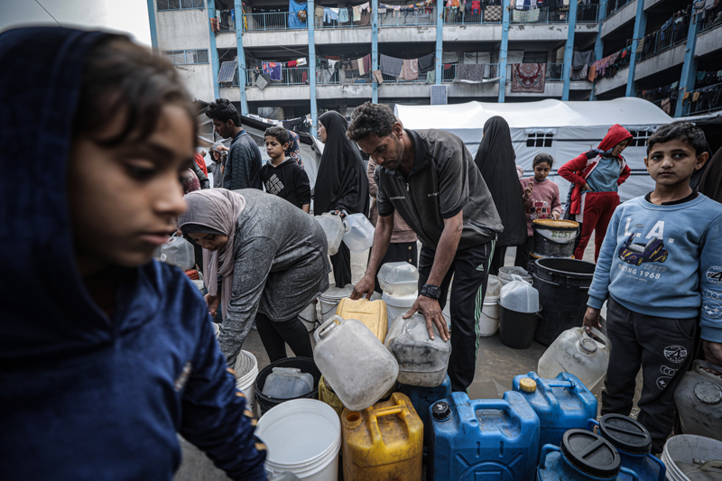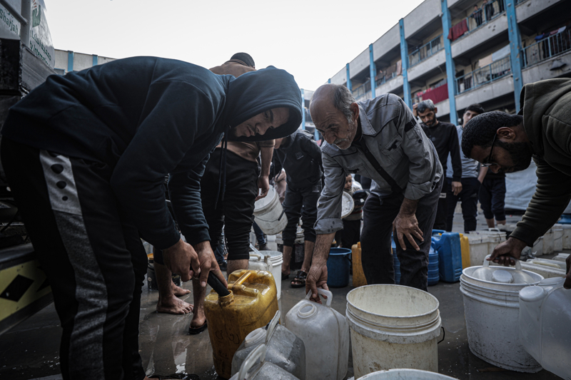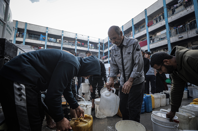 İsrail'in Gazze Şeridi'ne düzenlediği saldırılar sonucu altyapı ve su kuyularının ağır hasar görmesi nedeniyle su krizinin yaşandığı Gazze kentinin Rimal Mahallesi'nde, yerinden edilen Filistinlilerin kaldığı bir okula tankerle getirilen içme suyu dağıtıldı.