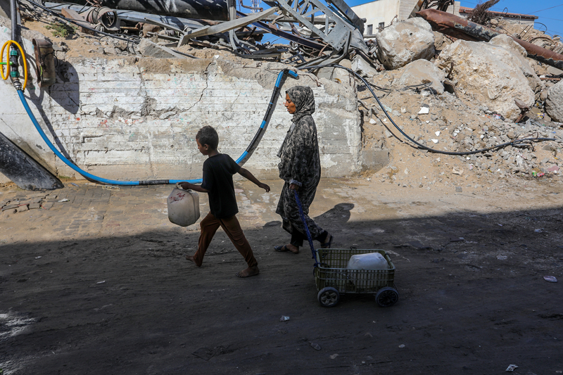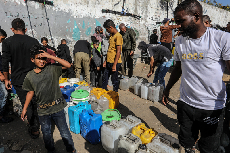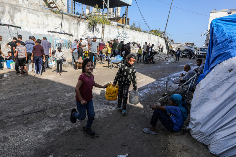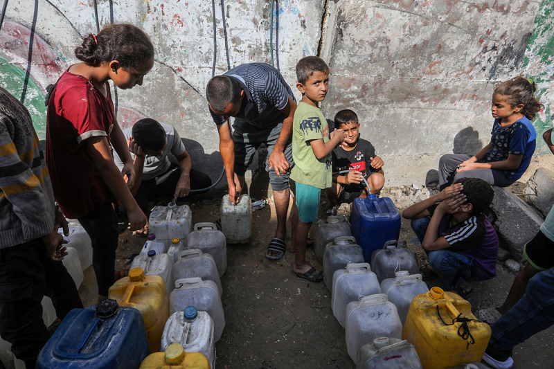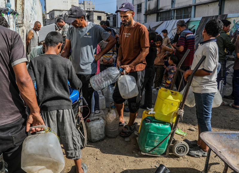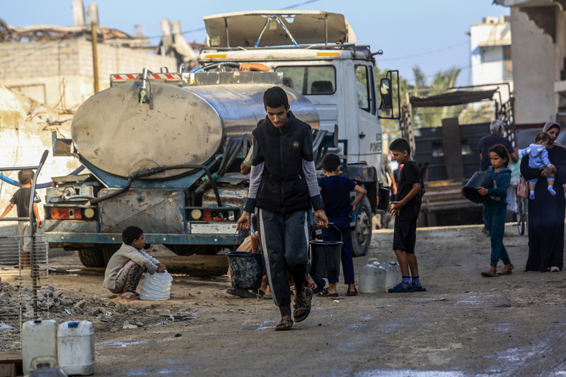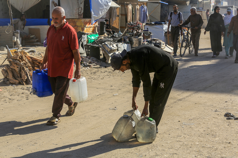 Han Yunus'taki Filistinliler, tankerlerden bidonlara doldurdukları suları çadırlarına ve enkaz halindeki evlerine taşıyor.